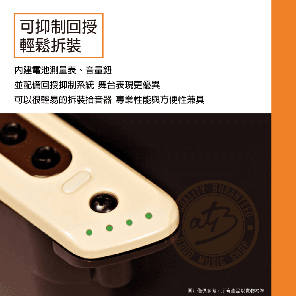 ◆ 配備回授抑制系統,舞台表現更優異,可輕易拆裝拾音器,專業性能與方便性兼具