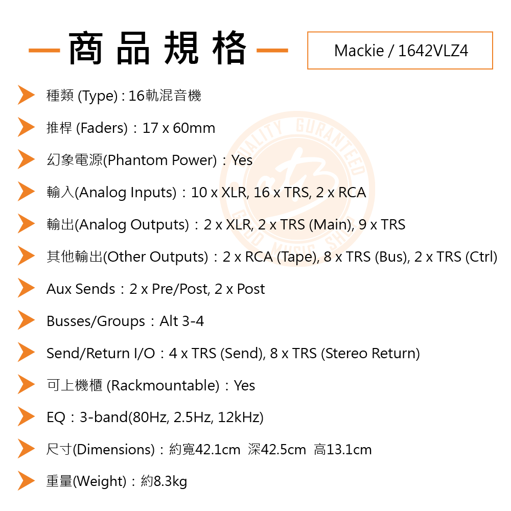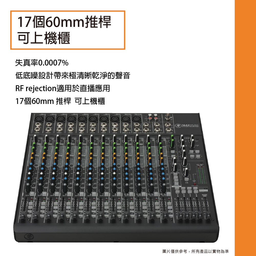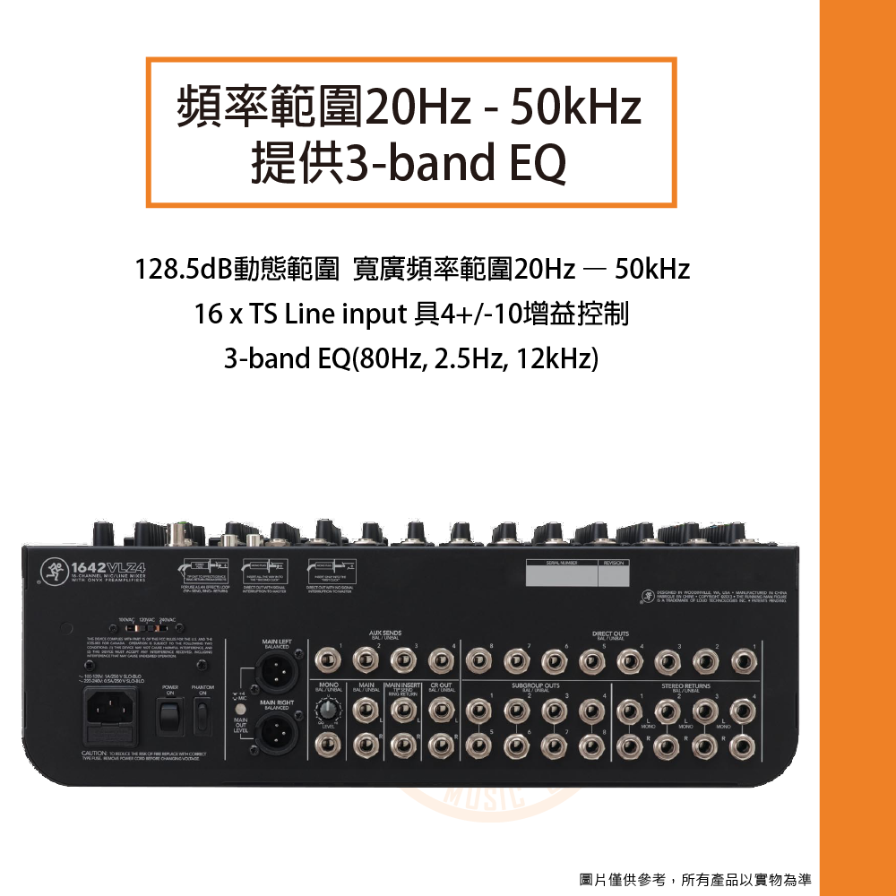 ◆ 寬廣頻率範圍20Hz – 50kHz,每軌具4+/-10增益控制、3-band EQ(80Hz, 2.5Hz, 12kHz)