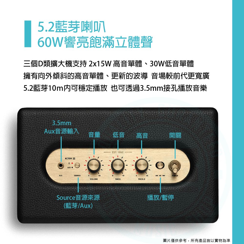 ◆ 5.2藍芽喇叭, 2x15W 高音單體、30W低音單體、D類放大器