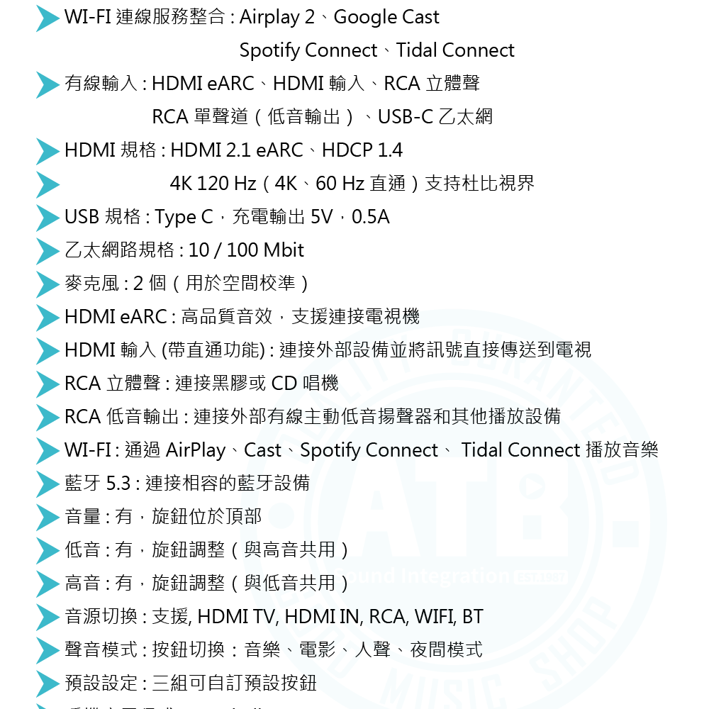 ◆ 可使用 Google Cast、AirPlay、Spotify Connect、Tidal Connect 播放音樂