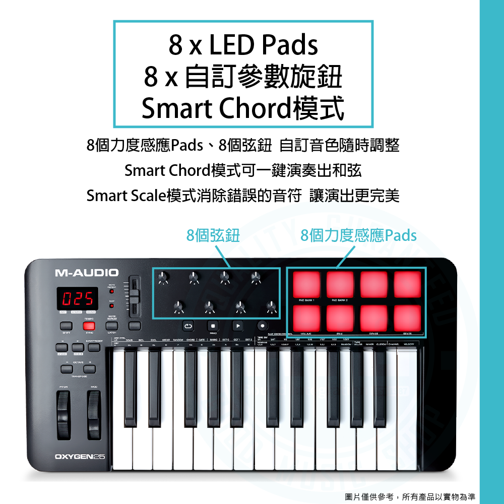◆ 8 x LED Pads、8 x 自訂參數旋鈕、1 x Faders