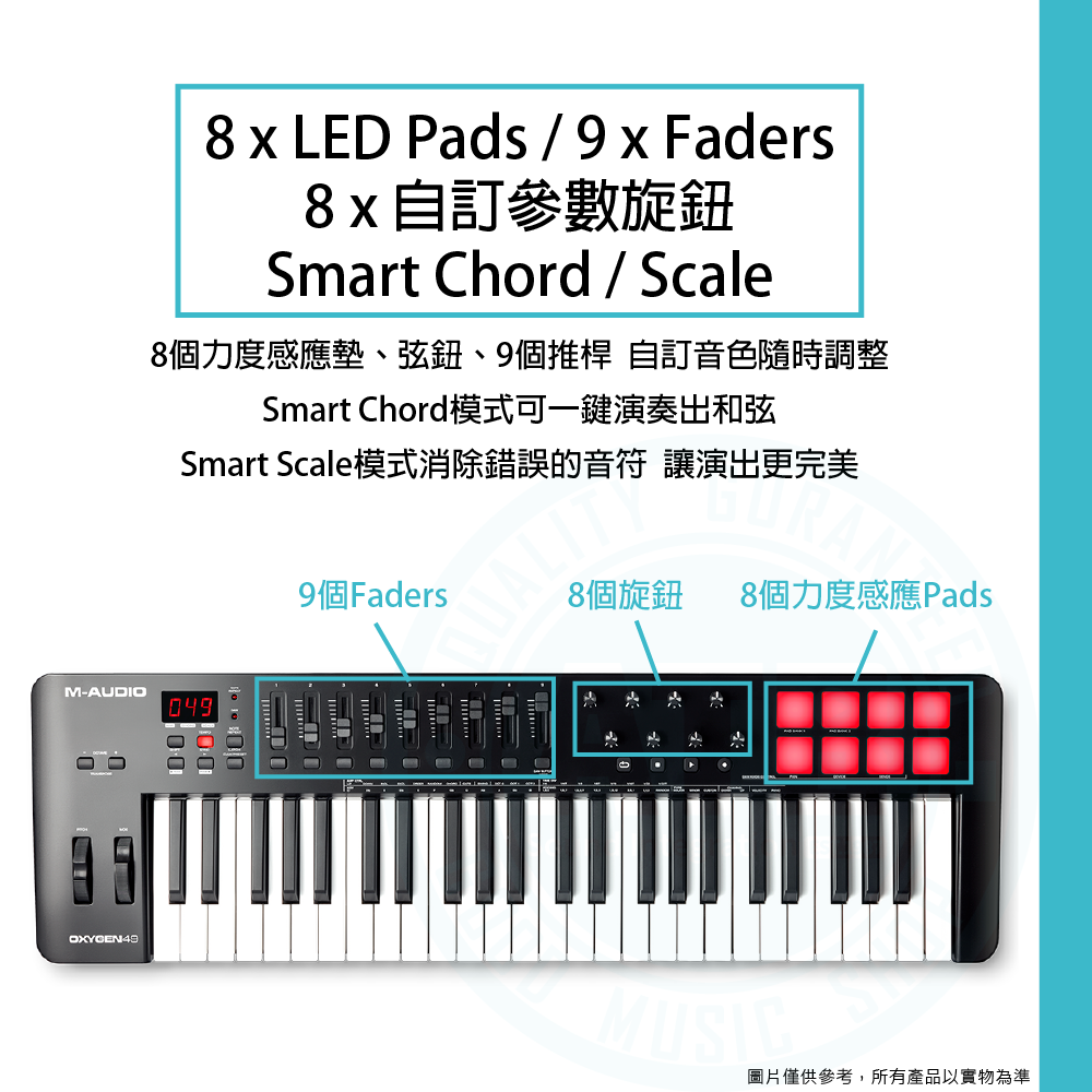 ◆ 8 x LED Pads、8 x 自訂參數旋鈕、9 x Faders