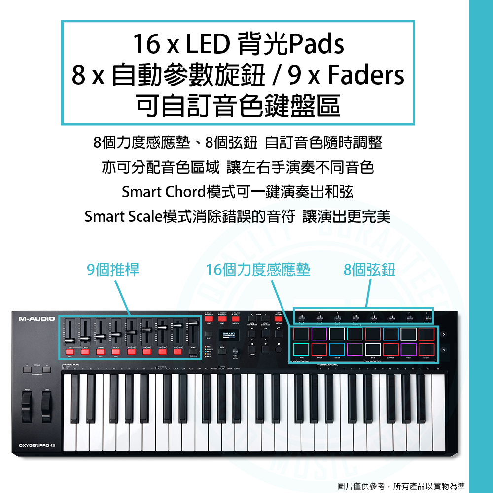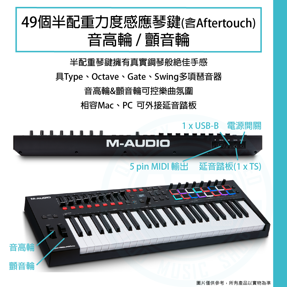 ◆49個半配重力度感應琴鍵,含Aftertouch