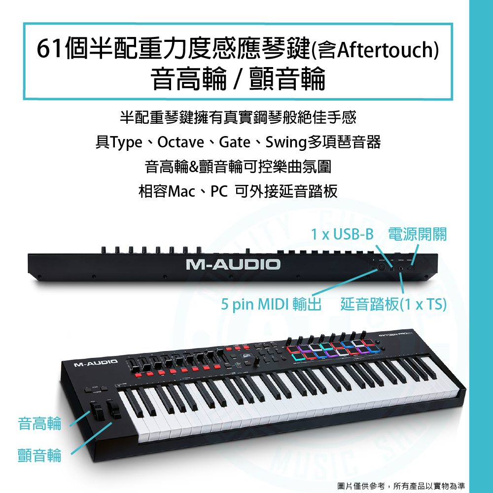 ◆61個半配重力度感應琴鍵,含Aftertouch