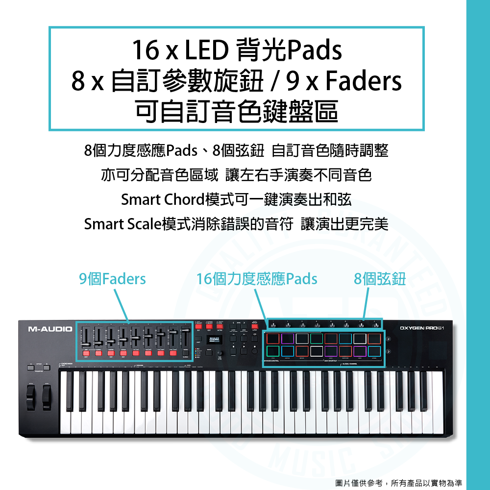 ◆16 x LED Pads、8 x 自訂參數旋鈕、9 x Faders