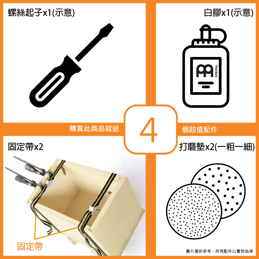◆ 內含螺絲起子x1、白膠x1、固定帶x2、木頭打磨墊x2