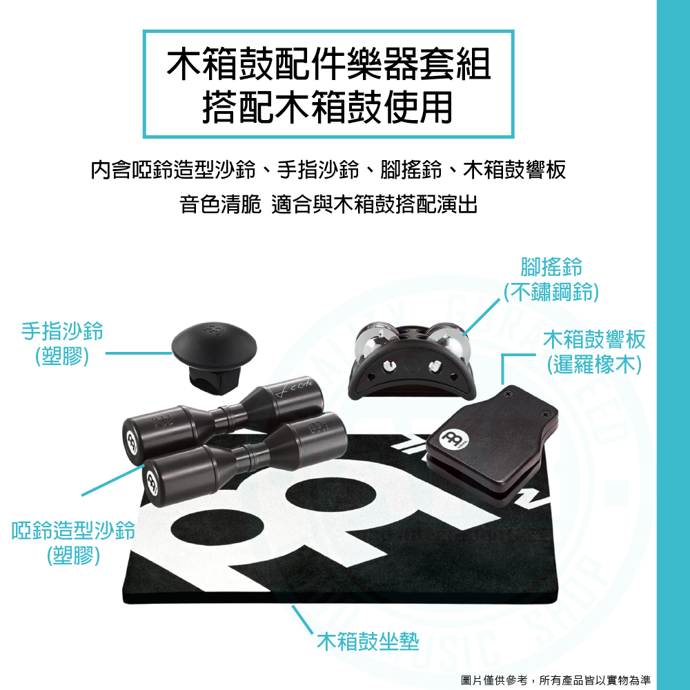 ◆ 內含啞鈴造型沙鈴、手指沙鈴、腳搖鈴、木箱鼓響板、Meinl木箱鼓坐墊