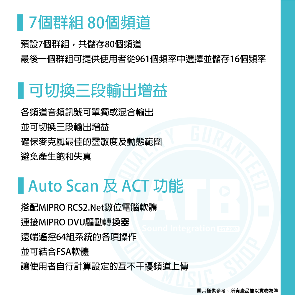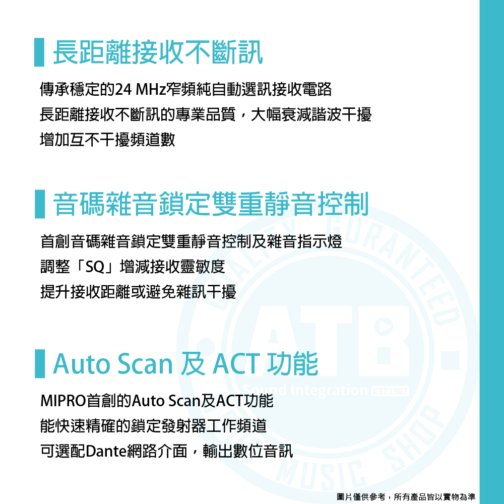 ◆MIPRO首創的Auto Scan及ACT功能快速鎖定發射器工作頻道
