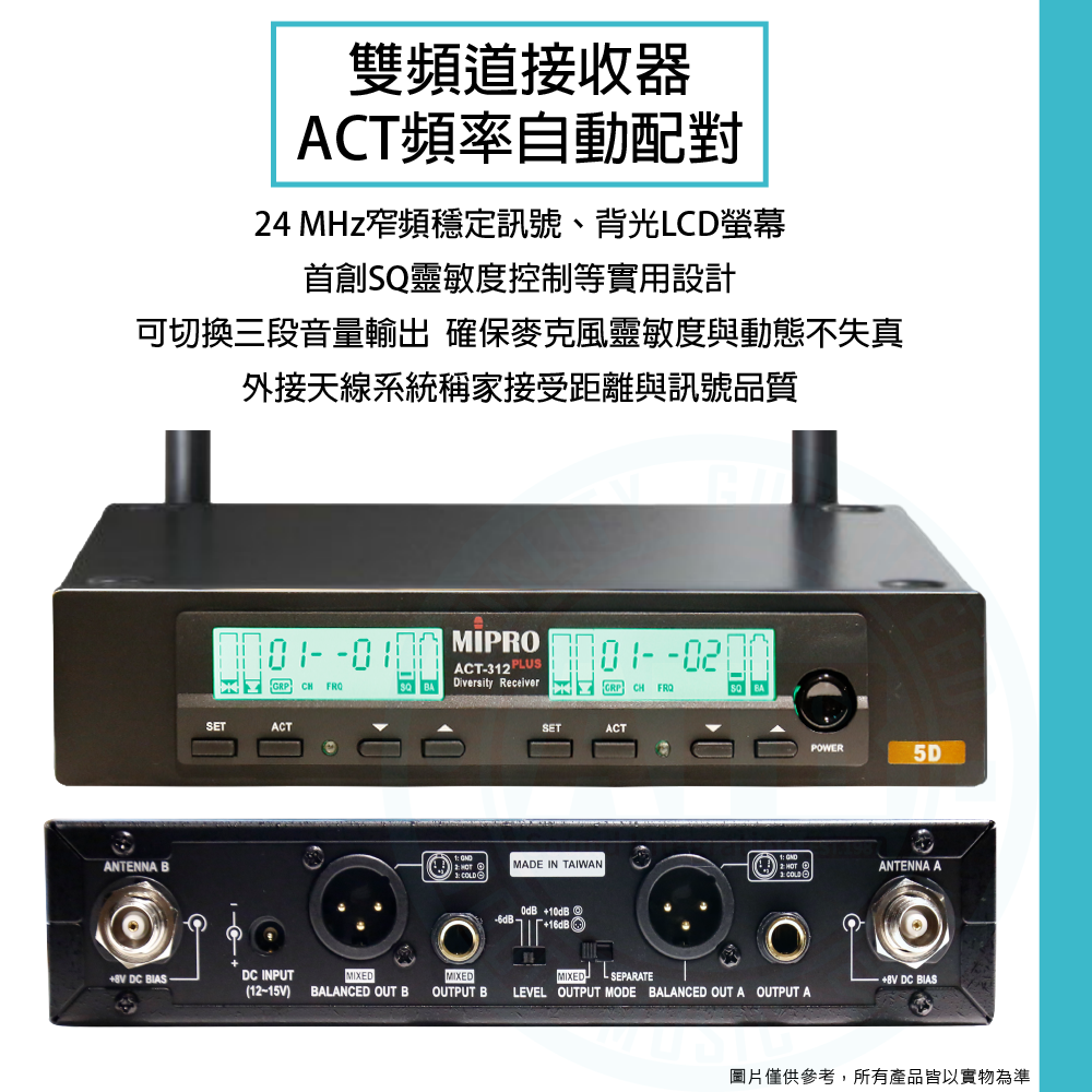 ◆ 雙頻道接收器,ACT頻率自動配對,採24 MHz窄頻穩定訊號