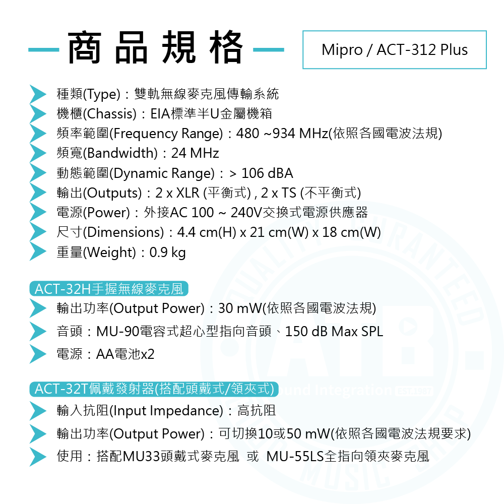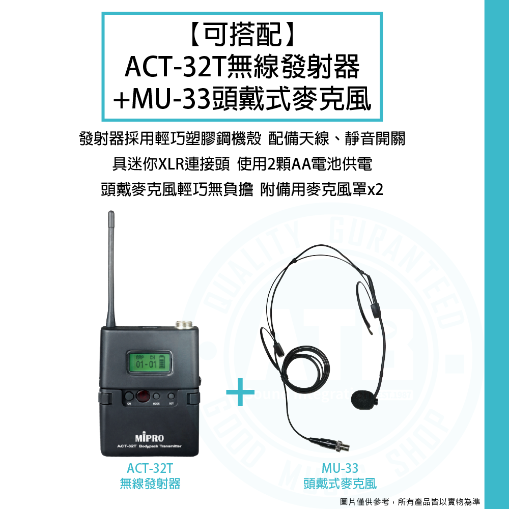 ◆ 頭戴式:ACT-32T無線發射器+MU-33頭戴式麥克風