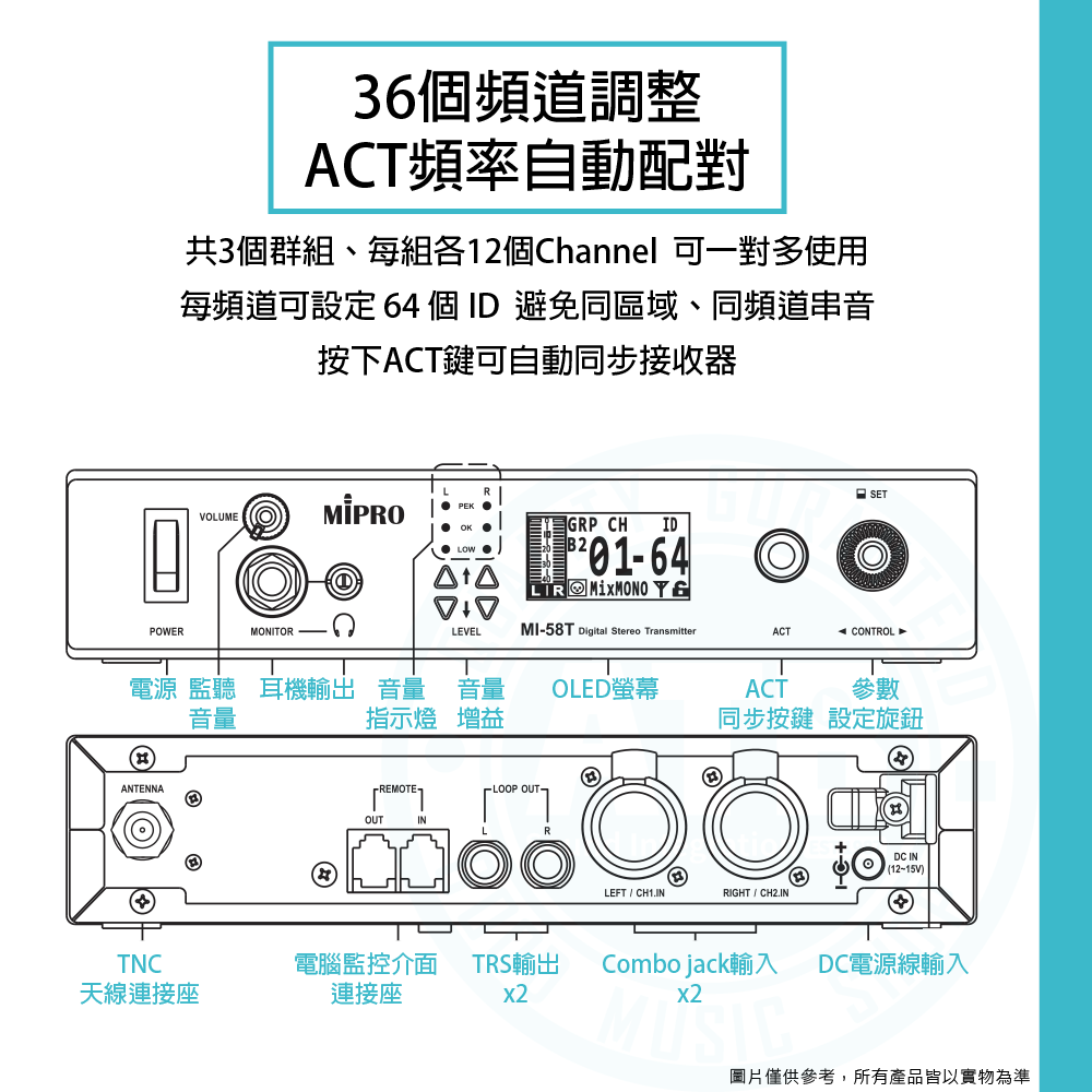 ◆ 36個頻道調整、ACT頻率自動配對,可一對多使用