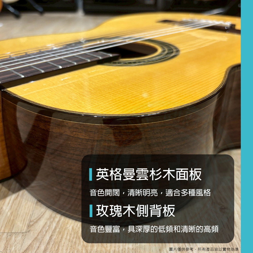 ◆英格曼雲杉木面板搭配玫瑰木背側板音色明亮、清澈,低頻豐富且有深度