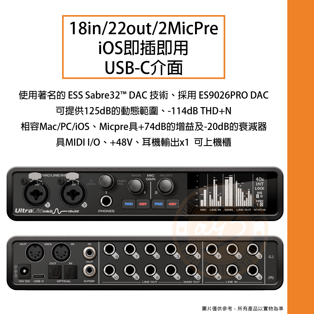 ◆ USB-C介面,相容Mac/PC/iOS、18in/22out/2MicPre