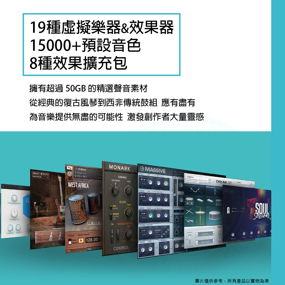 ◆ 19種虛擬樂器&效果器、15000+預設音色、8種效果擴充包
