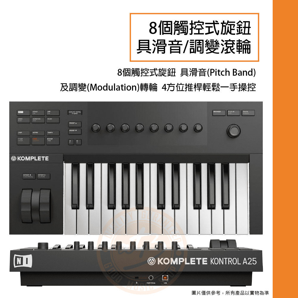 ◆ 8個觸控式旋鈕,具滑音(Pitch Band)及調變(Modulation)轉輪,4方位推桿輕鬆一手操控