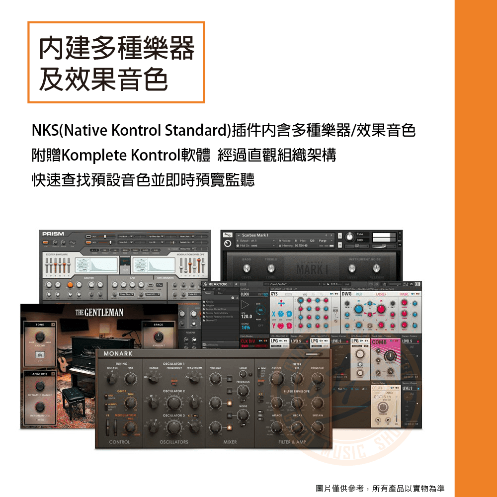 ◆ NKS(Native Kontrol Standard)插件內含多種樂器/效果音色,直觀的組織架構可快速查找預設音色並即時預覽監聽