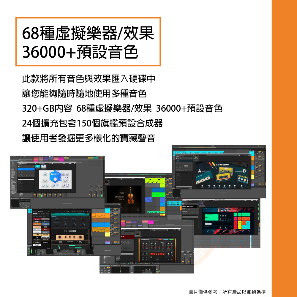 ◆ 320+GB內容、68種虛擬樂器/效果、36000+預設音色、24個擴充包含150個旗艦預設合成器