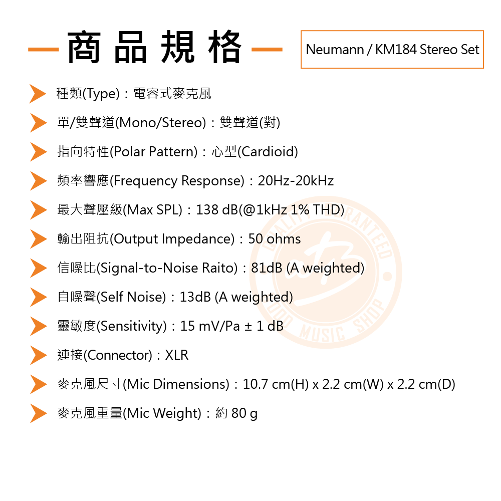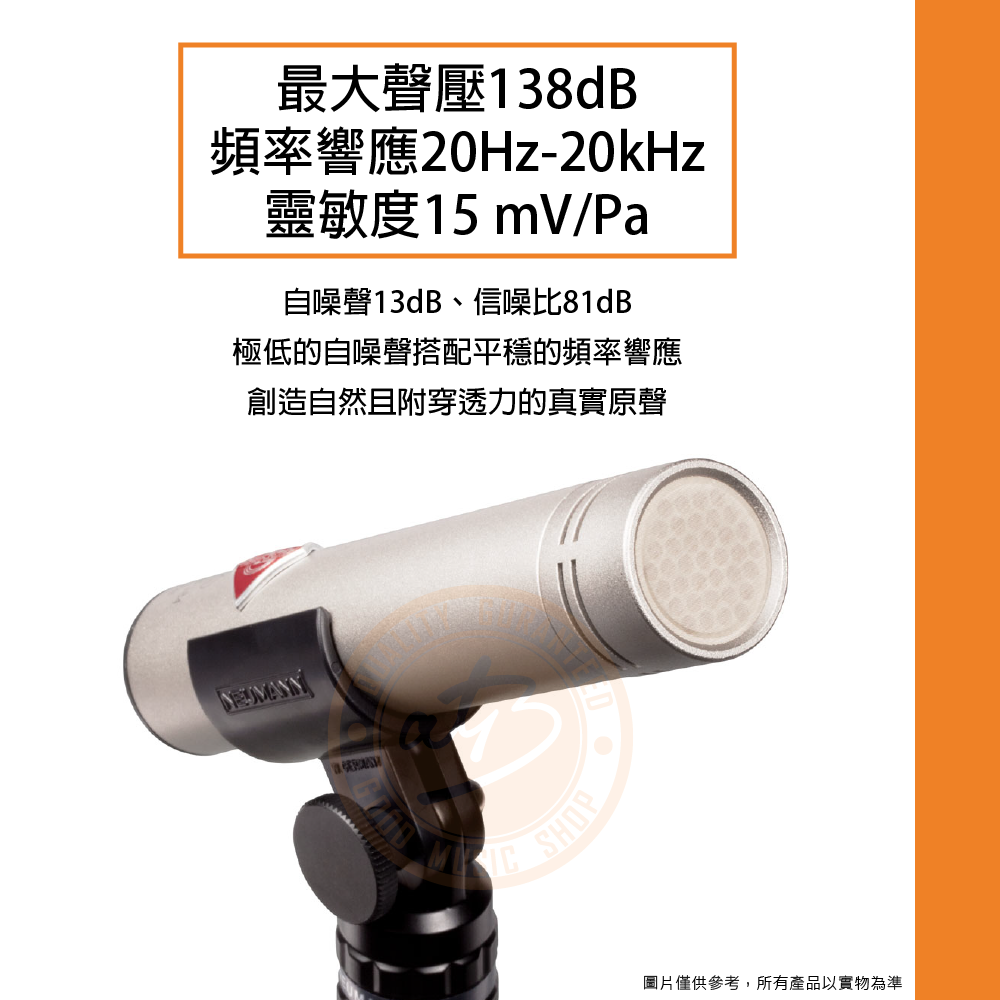 ◆ 最大聲壓138dB、頻率響應20Hz-20kHz、靈敏度15 mV/Pa