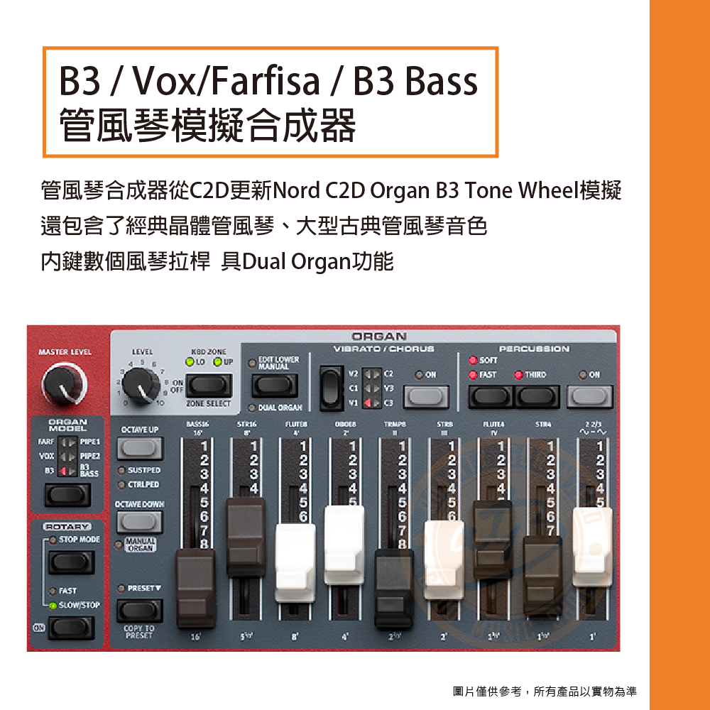 ◆ 風琴合成器使用Nord C2D 的B3 Tone Wheel模擬,內鍵數個風琴拉桿