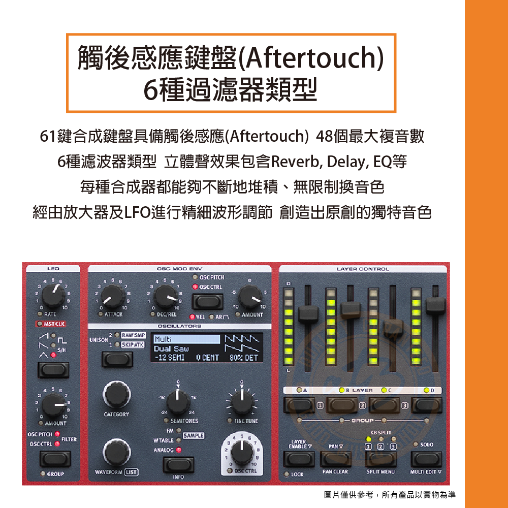 ◆ 具觸後感應(Aftertouch),48個最大複音數,6種濾波器類型