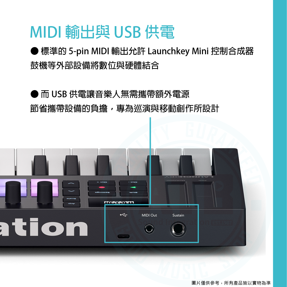 ◆標準的 5-pin MIDI 輸出允許 Launchkey Mini 控制合成器、鼓機等外部設備