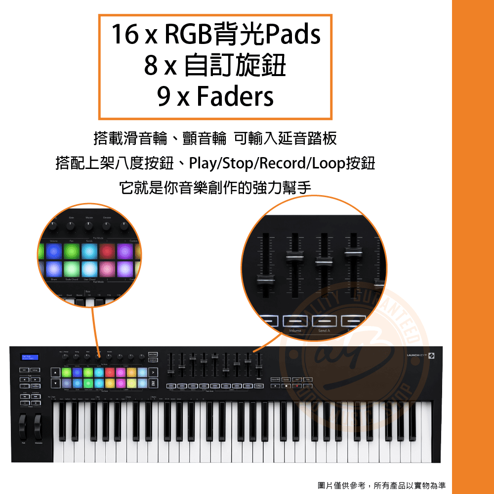 ◆ 16個RGB背光Pads、8個自訂義旋鈕、9個Faders