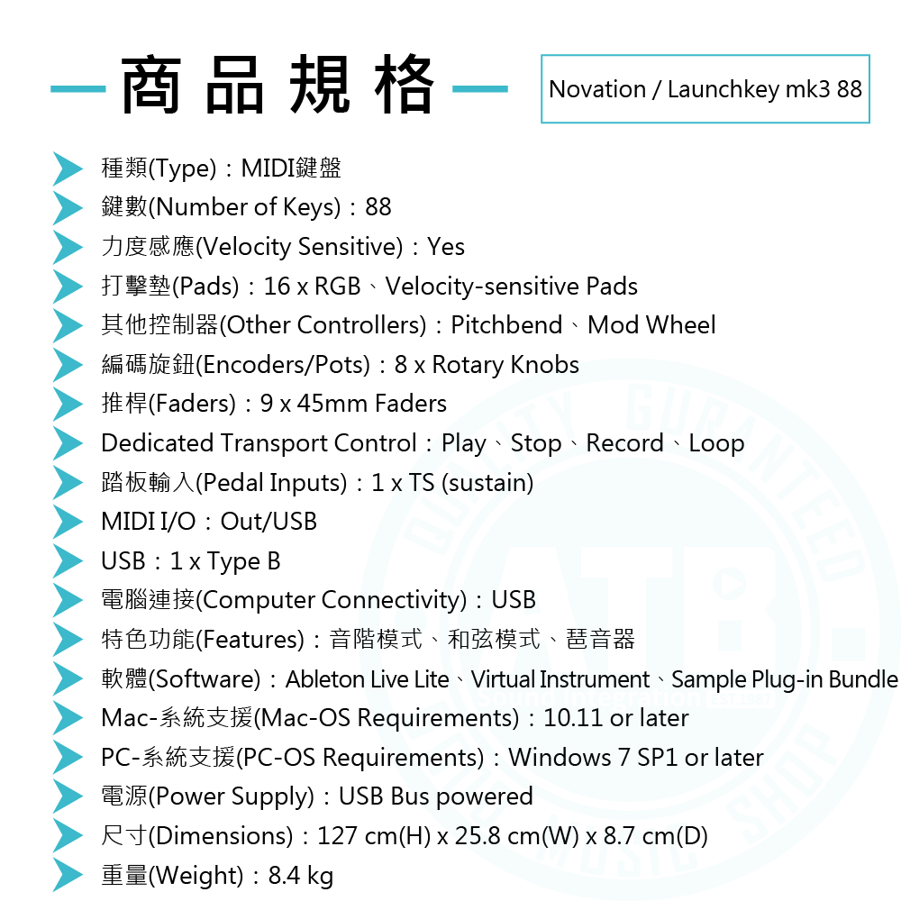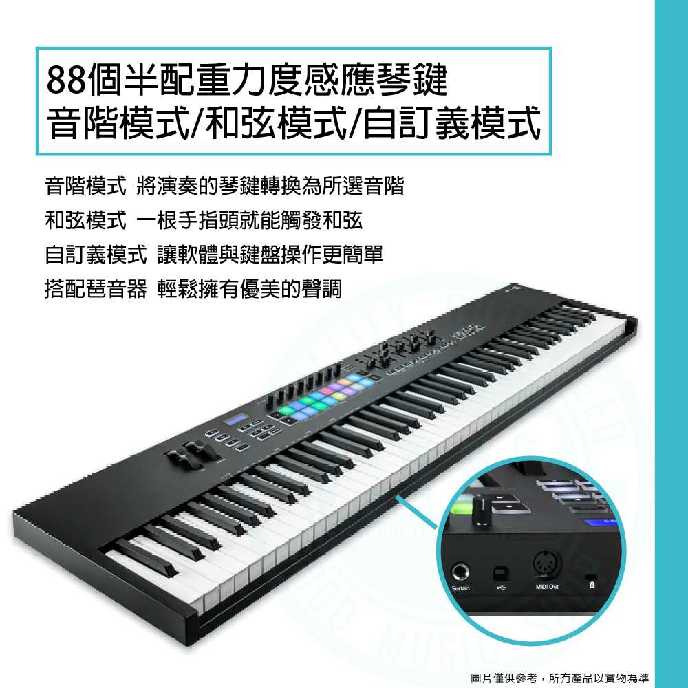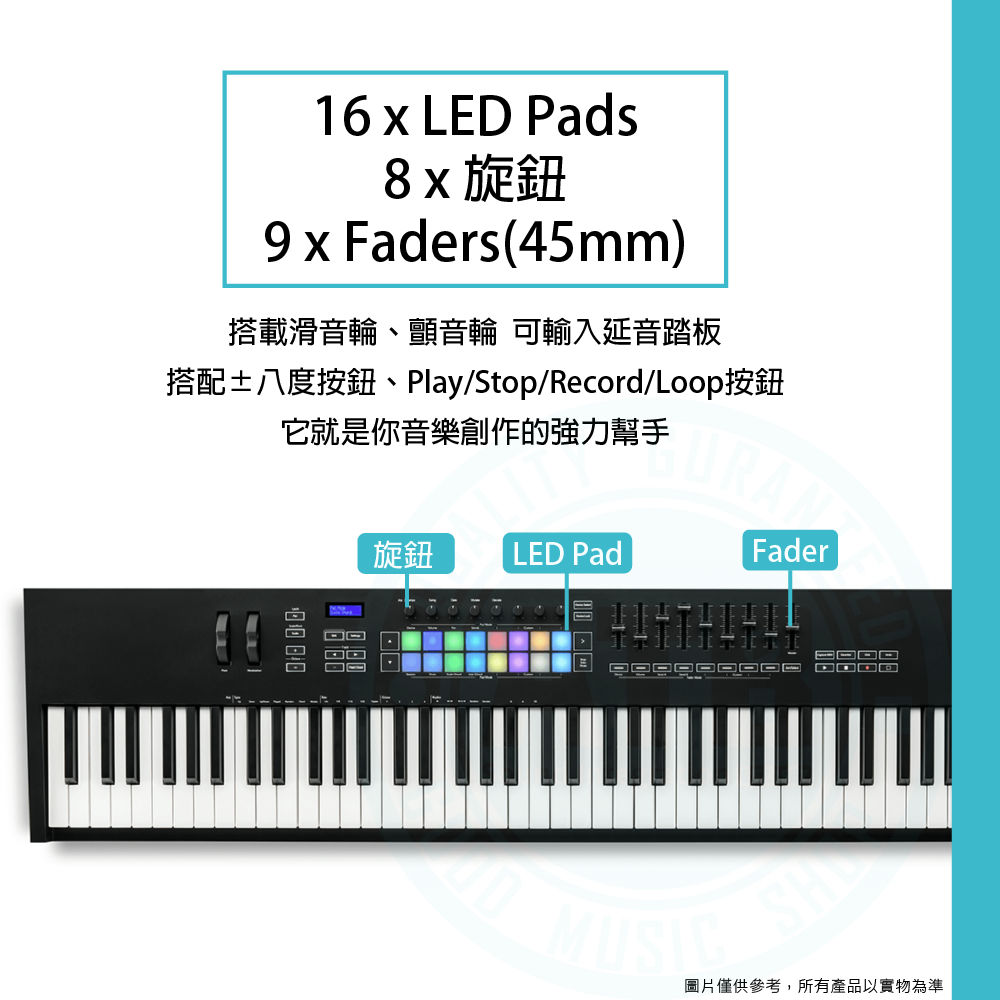 ◆ 8個旋鈕、16個RGB背光力度感應墊,1 個觸控條可調整音高