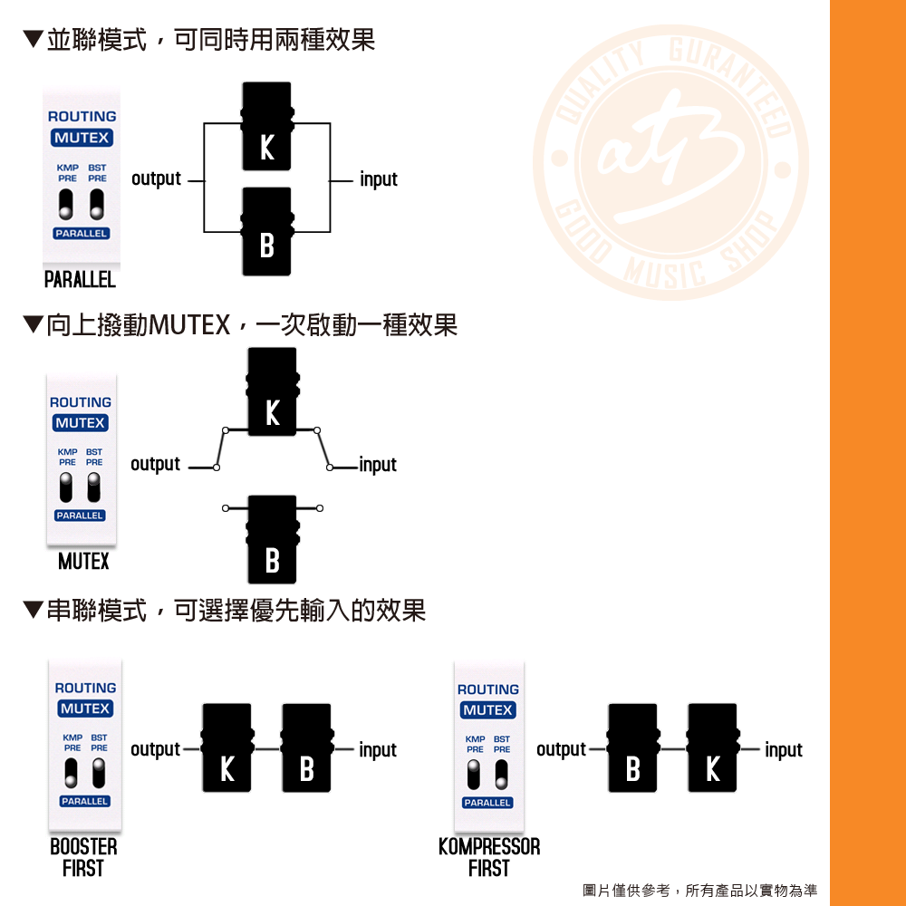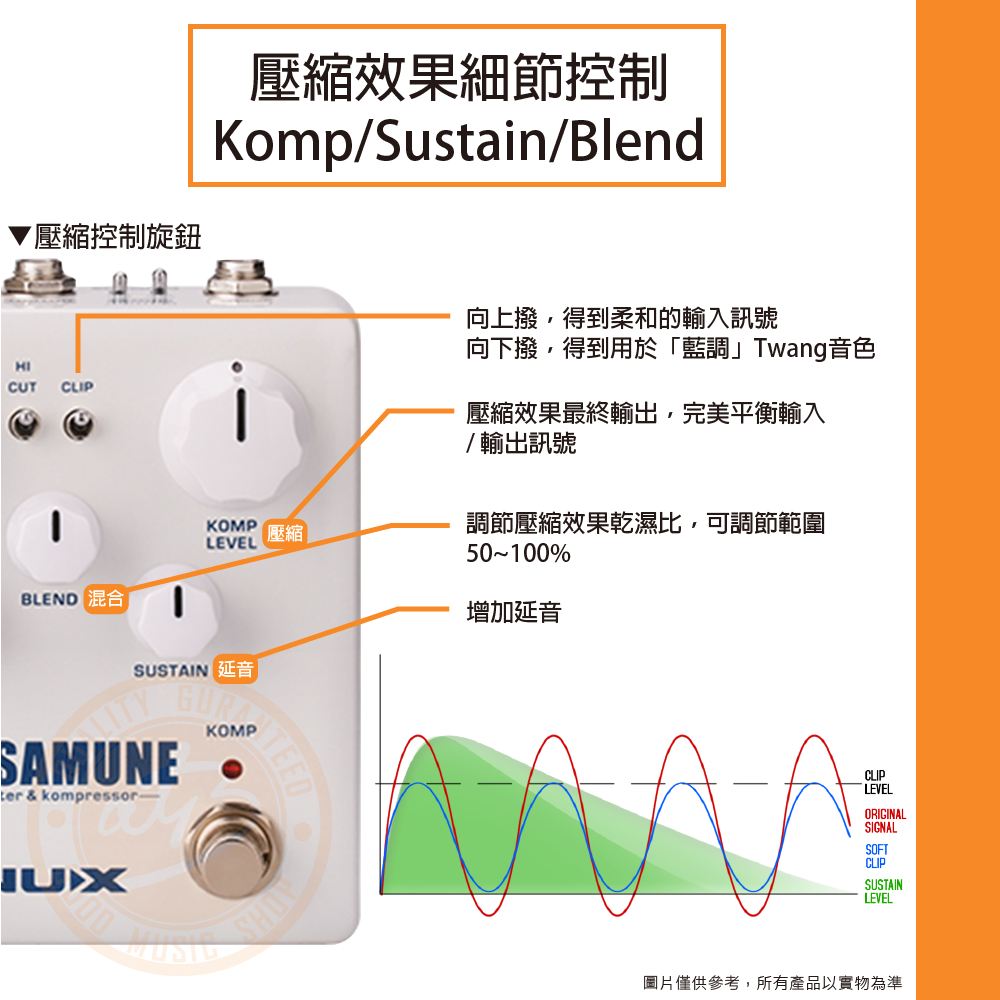 ◆壓縮控制旋鈕:Komp/Sustain/Blend,可切換藍調感Twang音色