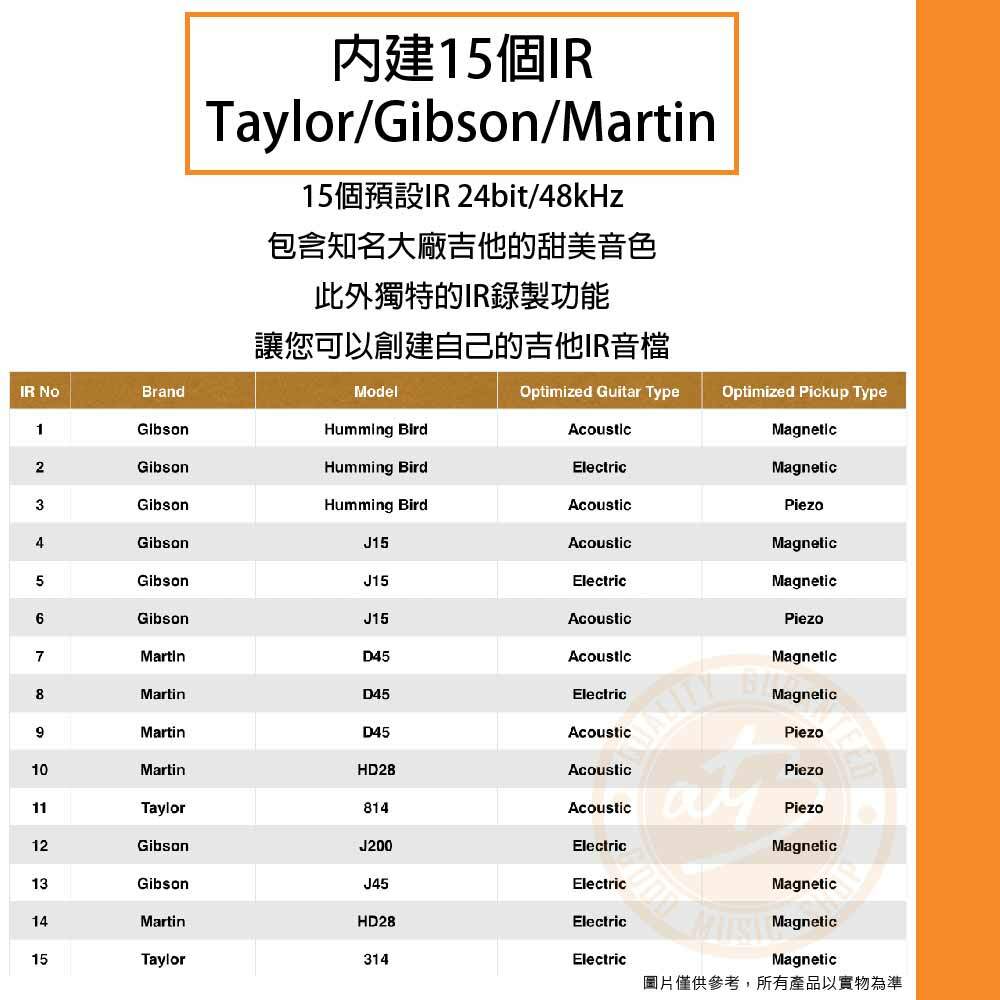 ◆ 15個預設IR,含Taylor、Gibson、Martin吉他音色