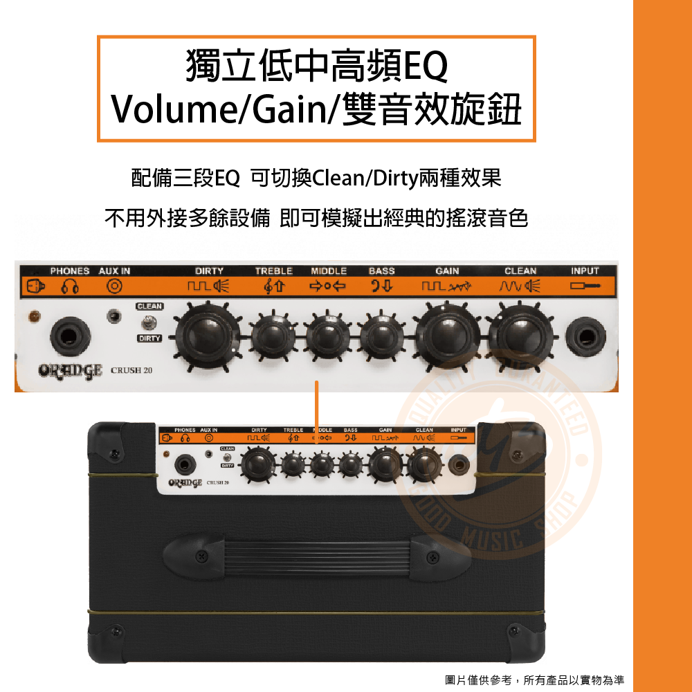 ◆ 搭載獨立低中高頻EQ、Volume、Gain、Clean、Dirty旋鈕