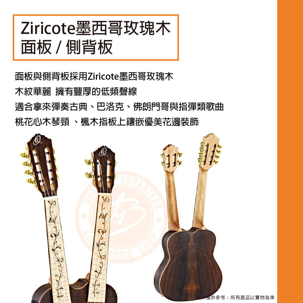◆ 面板與側背板採用Ziricote墨西哥玫瑰木,木紋華麗,擁有豐厚的低頻聲線