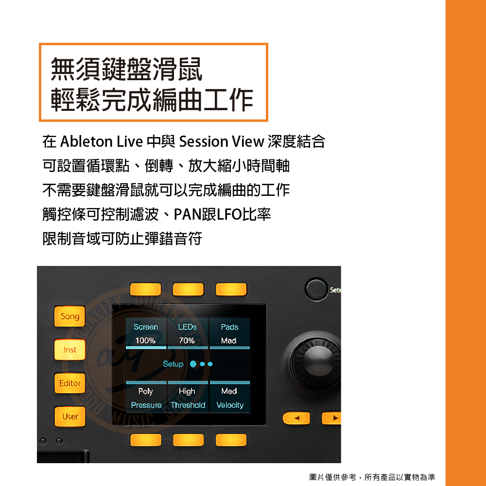 ◆ 32個力度感應打擊墊,RBG色彩根據內容可變換顏色,8個編碼器控制參數設定