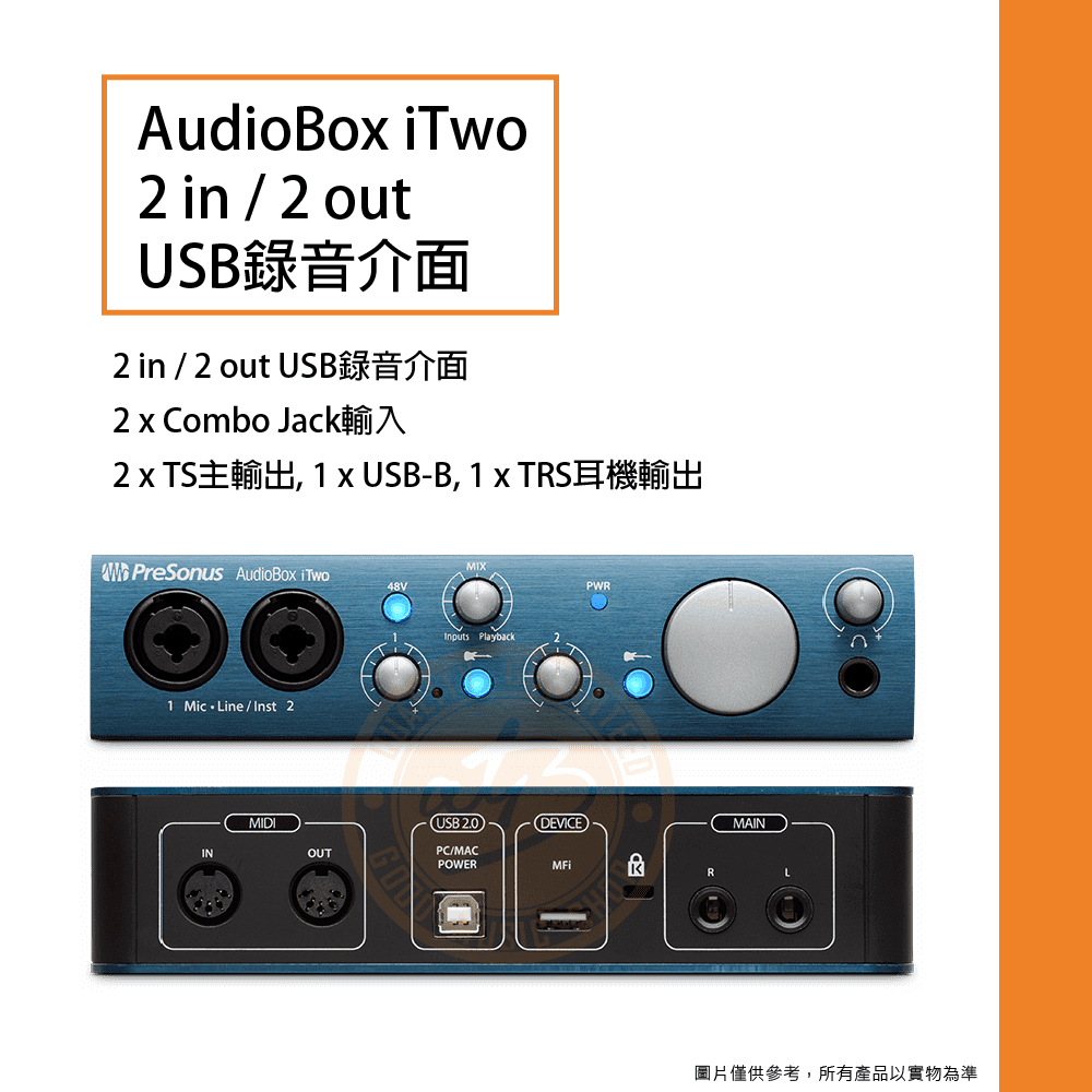 ◆ AudioBox iTwo 2 in / 2 out USB錄音介面,2 x Combo Jack輸入,2 x TS主輸出