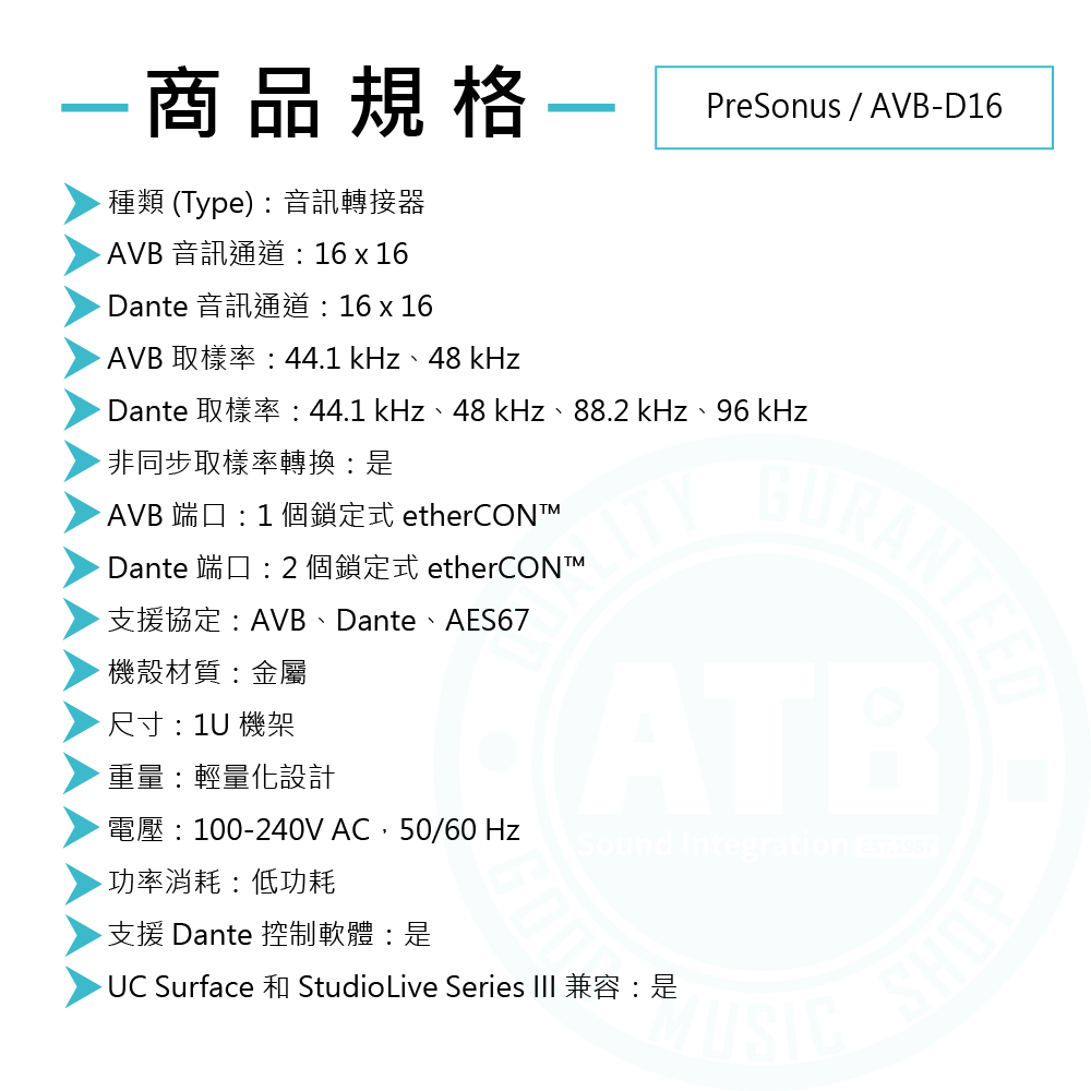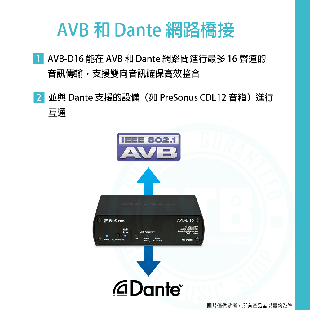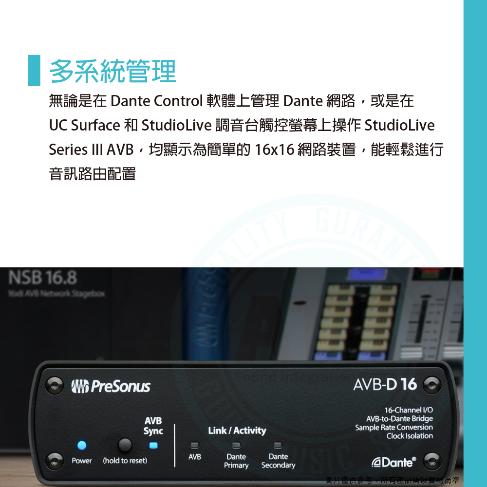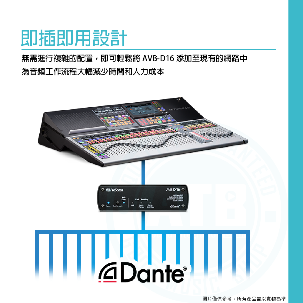 ◆可同時支援 AVB 和 Dante 網路,提供 16 x 16 音訊通道