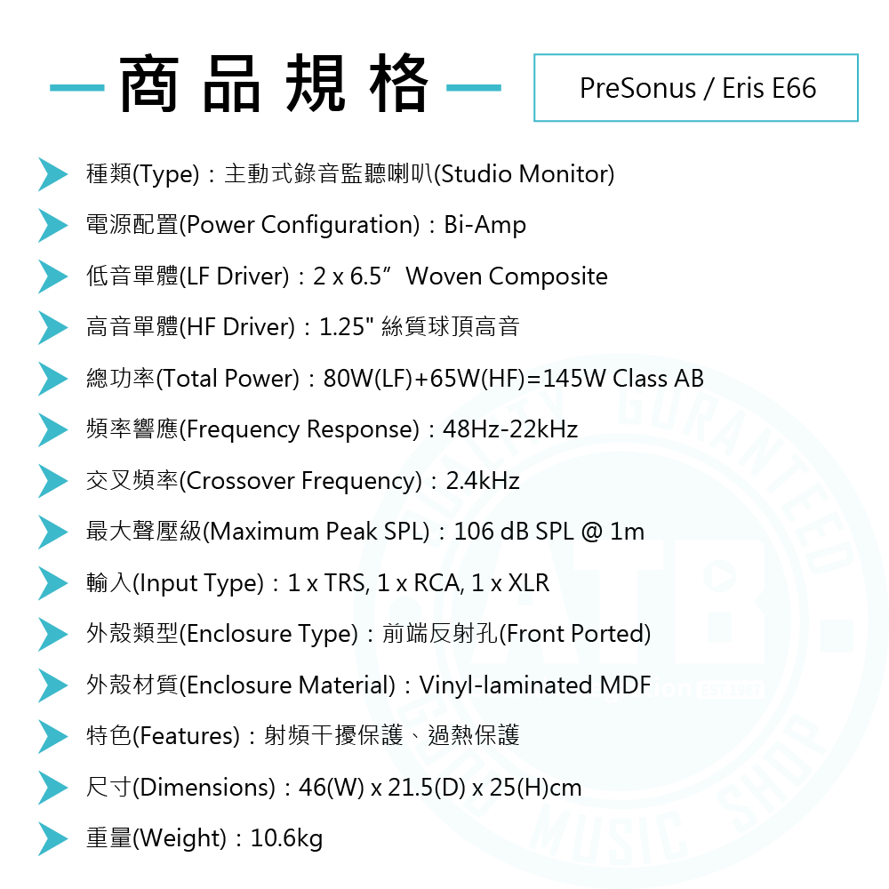 ◆ 80W雙6.5吋低音/中音單體,65W 1.25吋高音單體