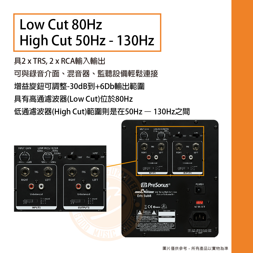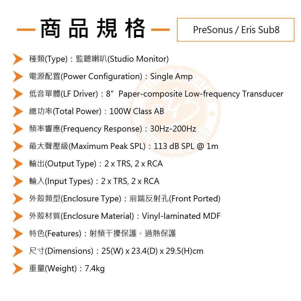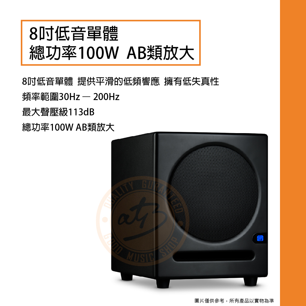 ◆ 8吋低音單體,提供平滑的低失真響應,頻率範圍30Hz – 200Hz