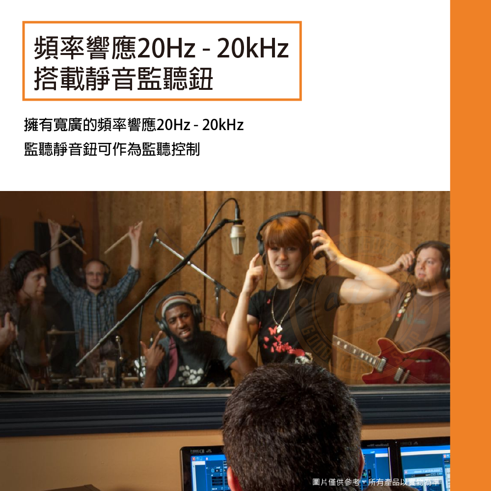 ◆ 寬廣的頻率響應20Hz - 20kHz,監聽靜音鈕可作為監聽控制