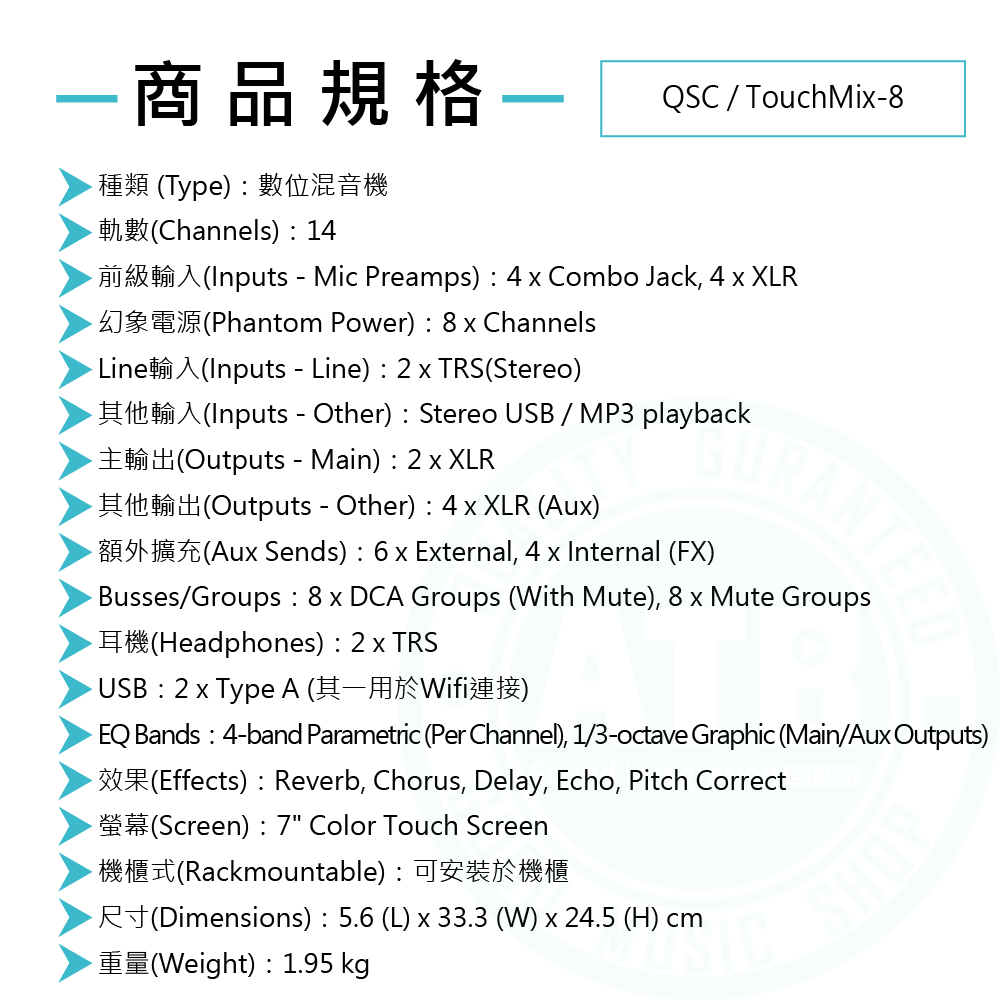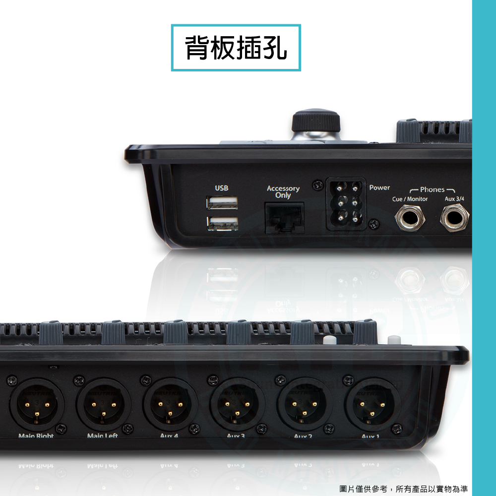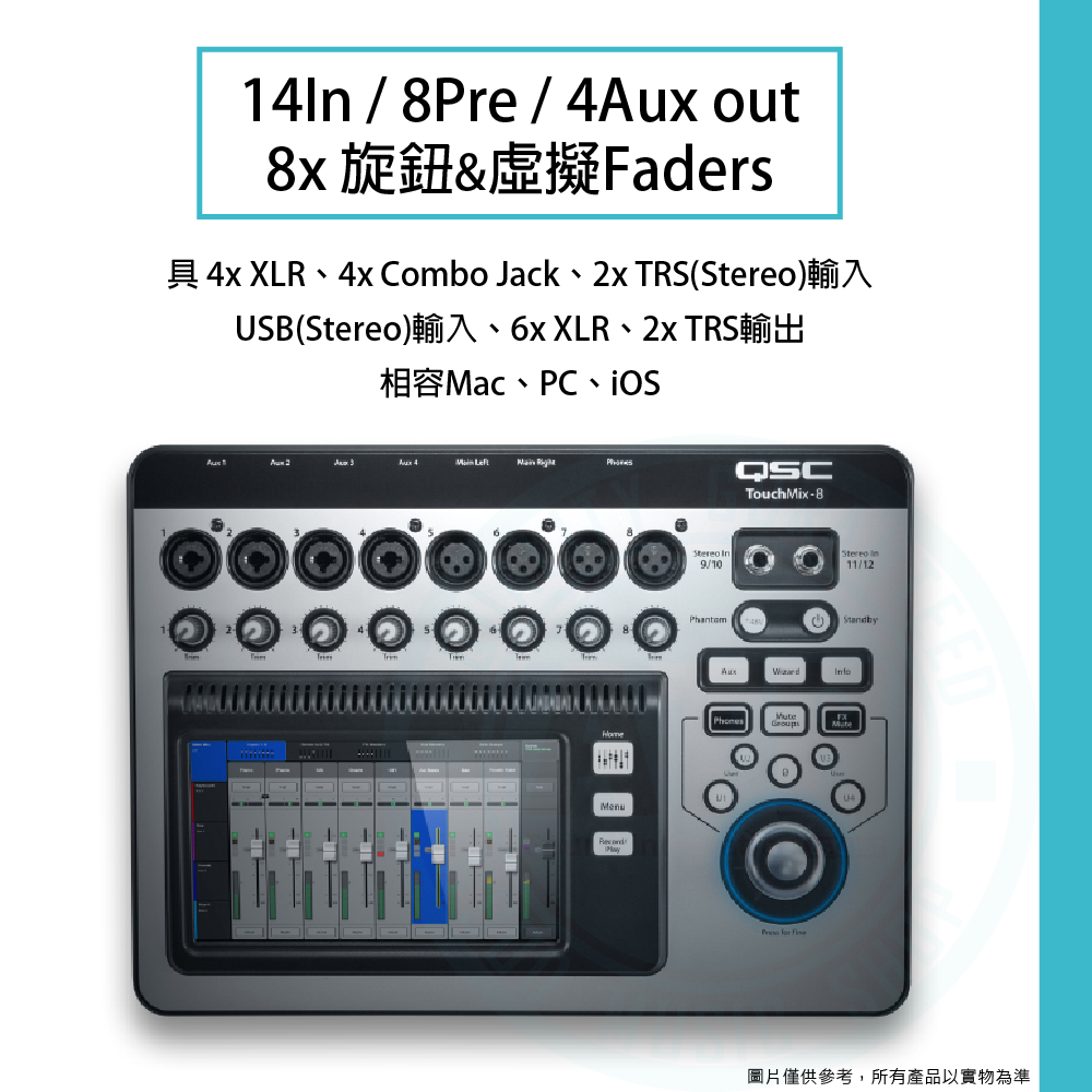 ◆ 14In / 8Pre / 4Aux out / 8x旋鈕&虛擬Faders