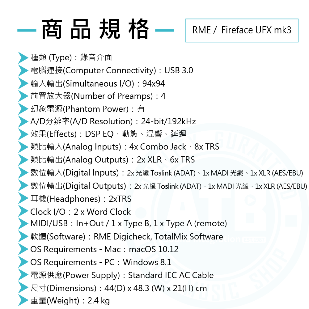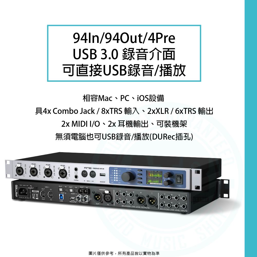 ◆USB 3.0 錄音介面,94In/94Out/4Pre,24-bit/192kHz