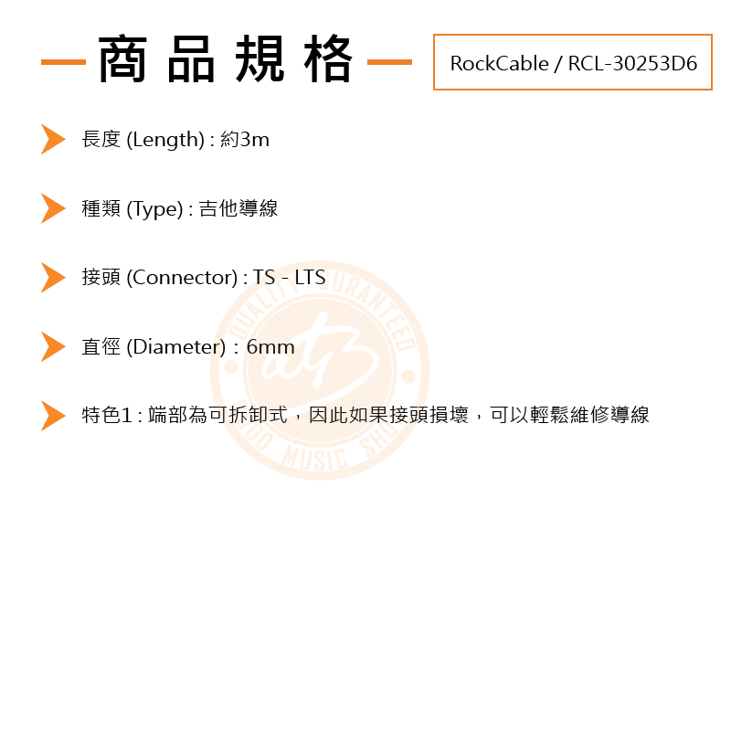 RockCable / RCL-30253D6 (3m) 吉他導線 TS - LTS