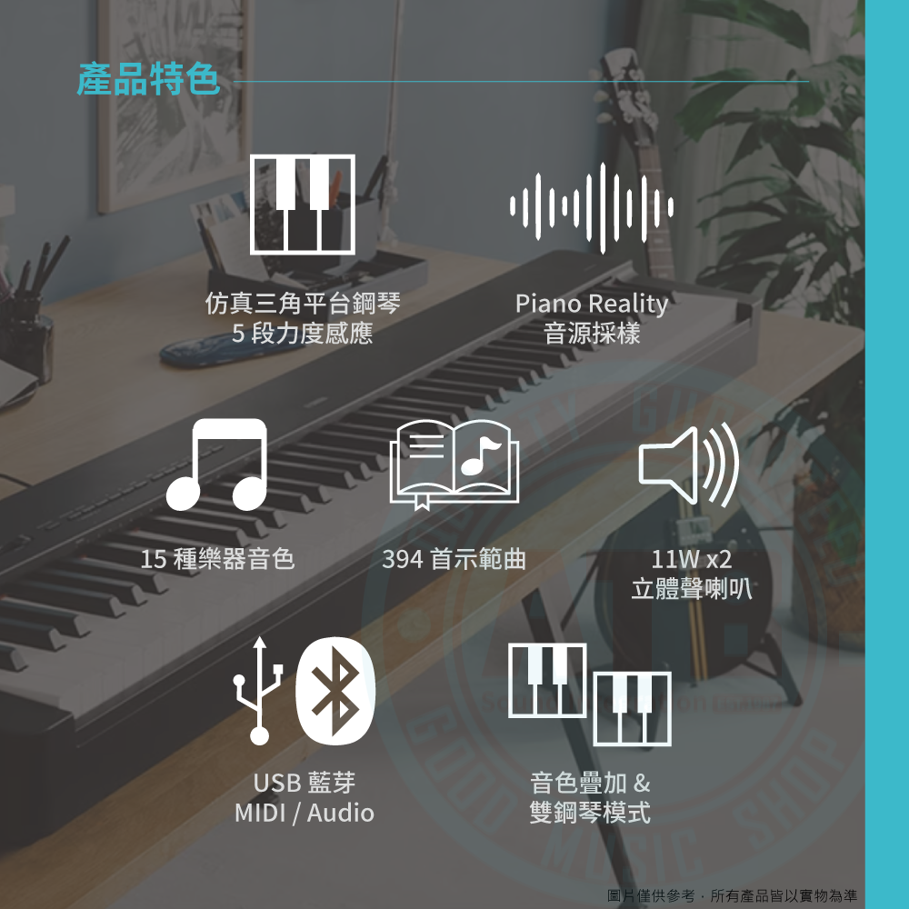 ◆ 採象牙質感錘擊式琴鍵,具備擒縱機制與5種力度感應