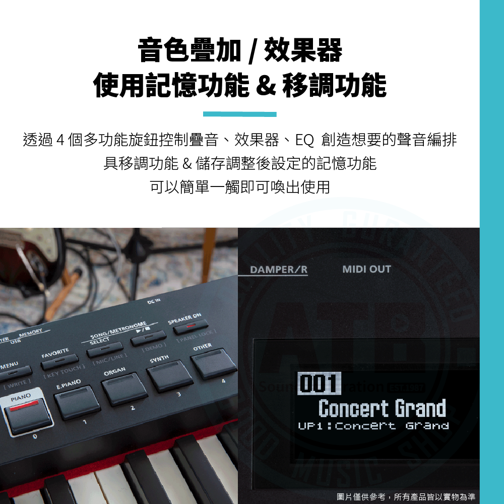 ◆ 內建音色疊加、移調、EQ調整及使用記憶功能