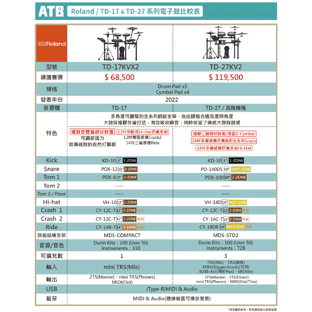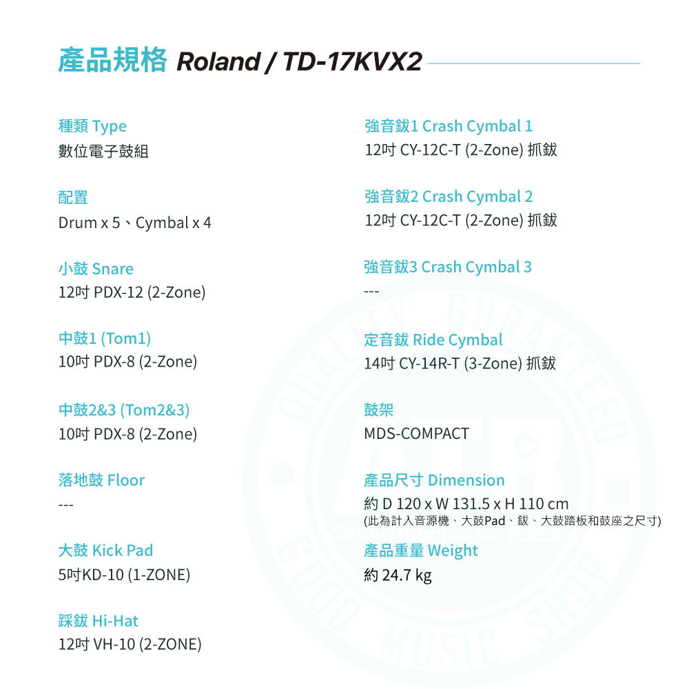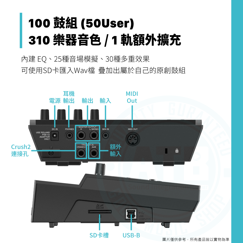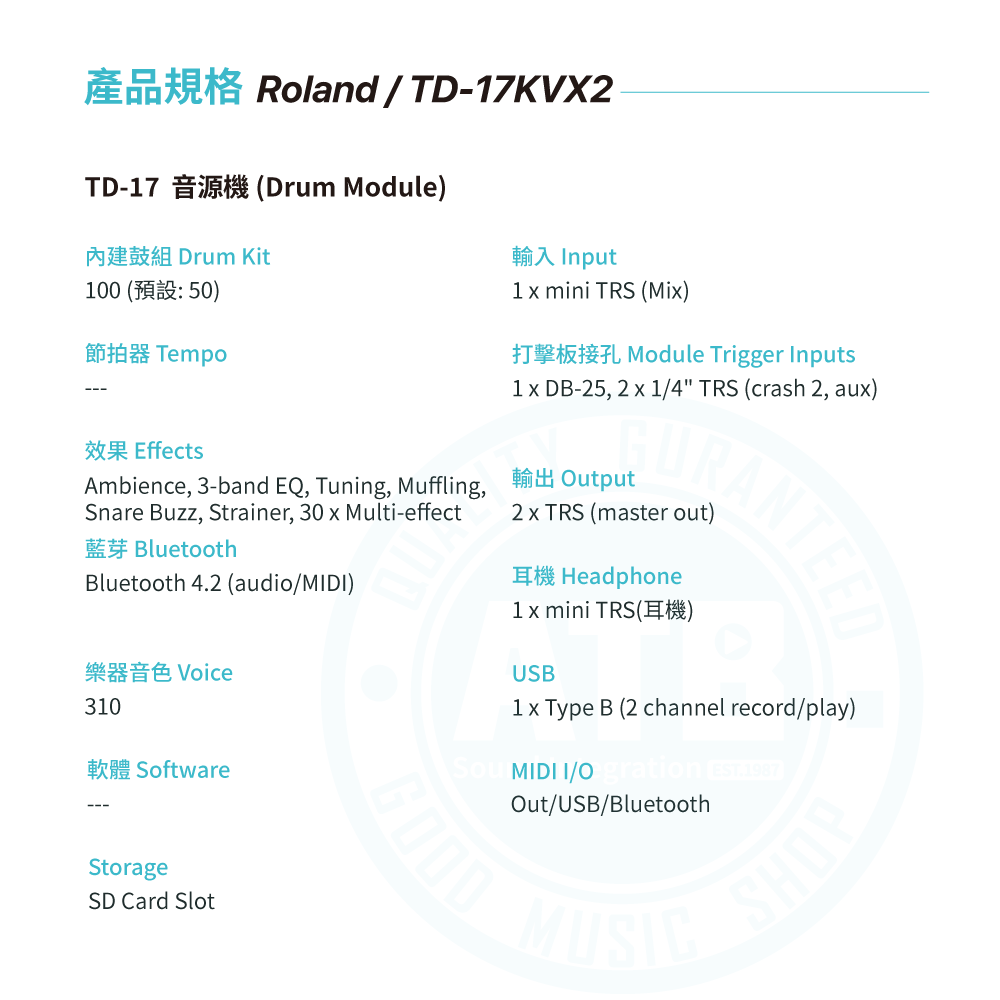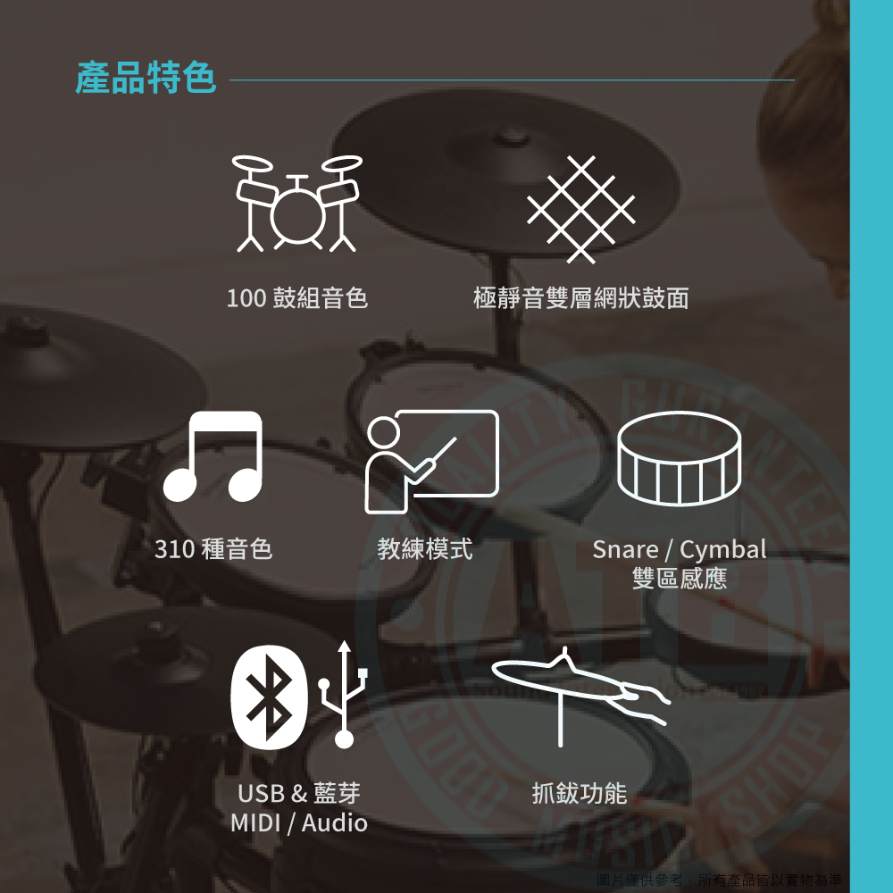 ◆ 搭載TD-17音源機,內建100鼓組、310樂器音色、1軌額外擴充