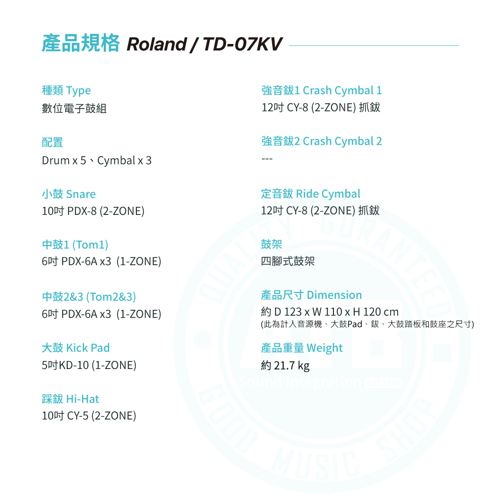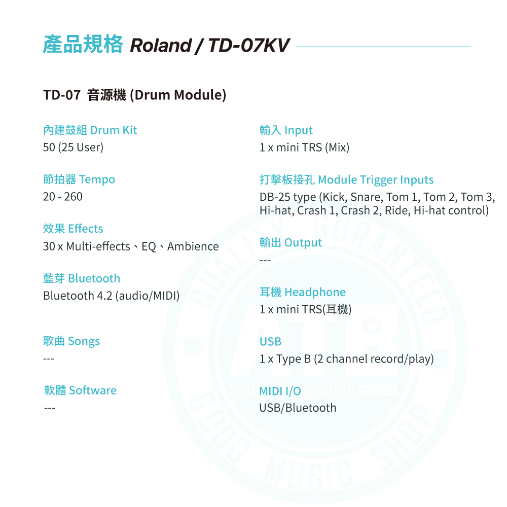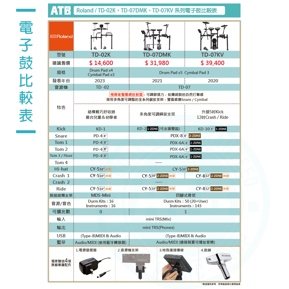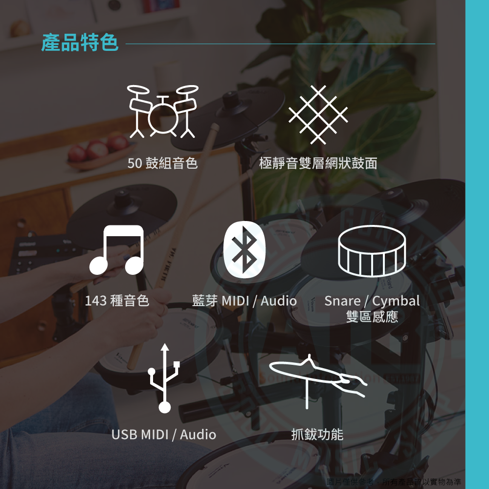 ◆ 搭載TD-07音源機,內建50鼓組+143樂器音色