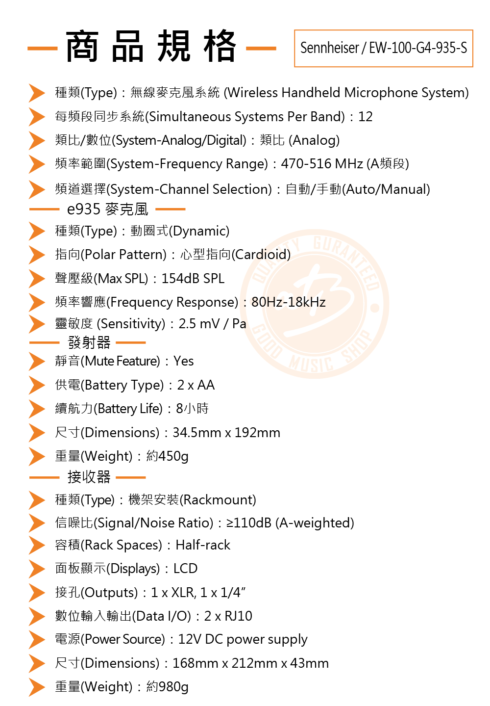 ◆ 心型指向動圈式麥克風,頻率響應80-18kHz