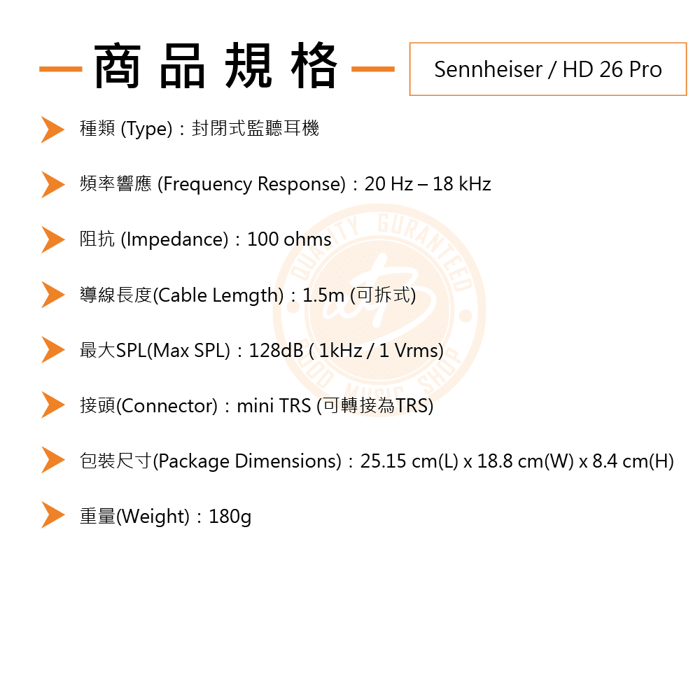 ◆ 頻率響應20Hz – 18kHz,最大聲壓級128dB