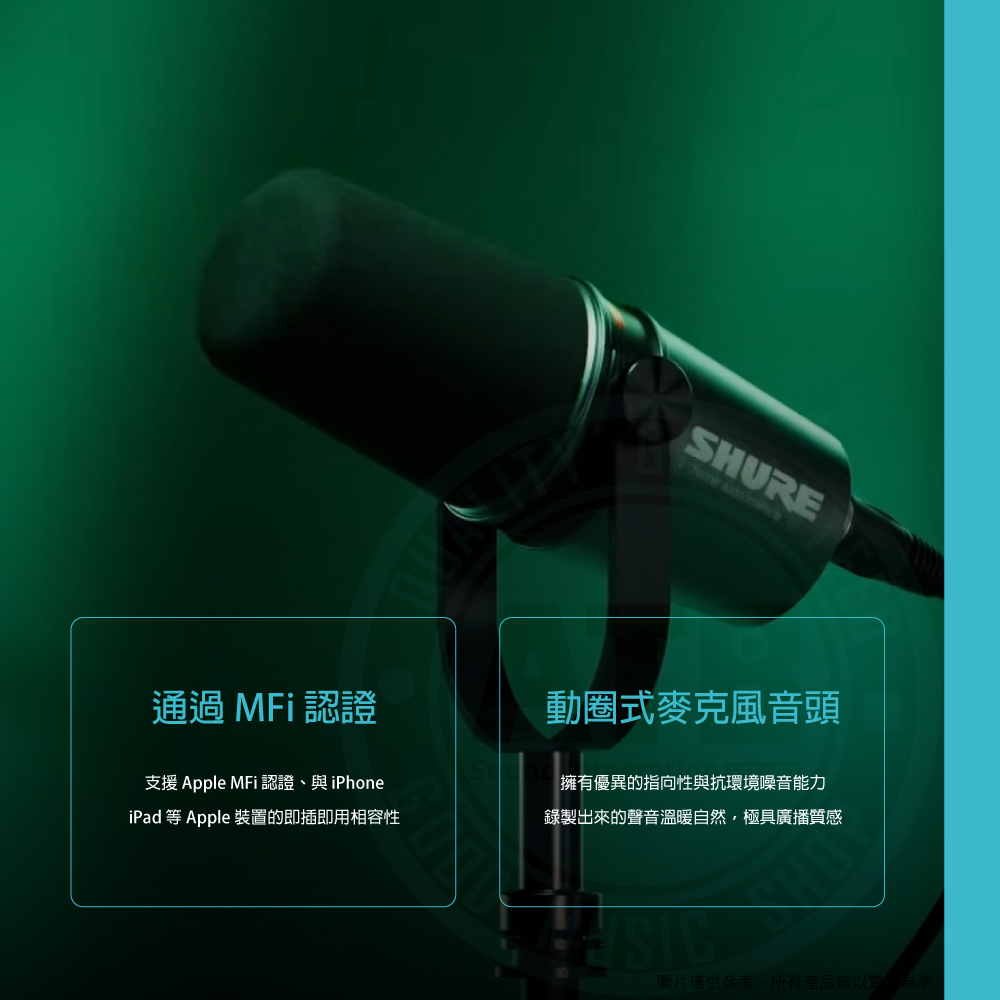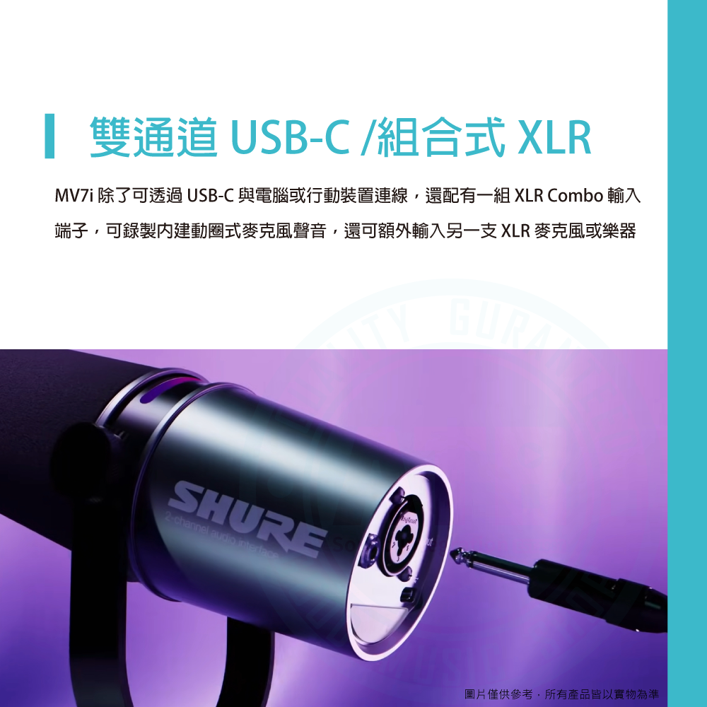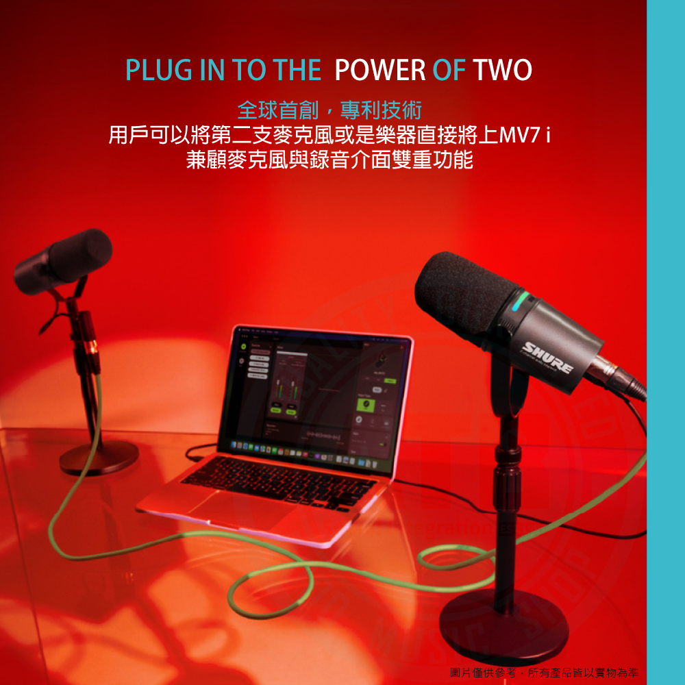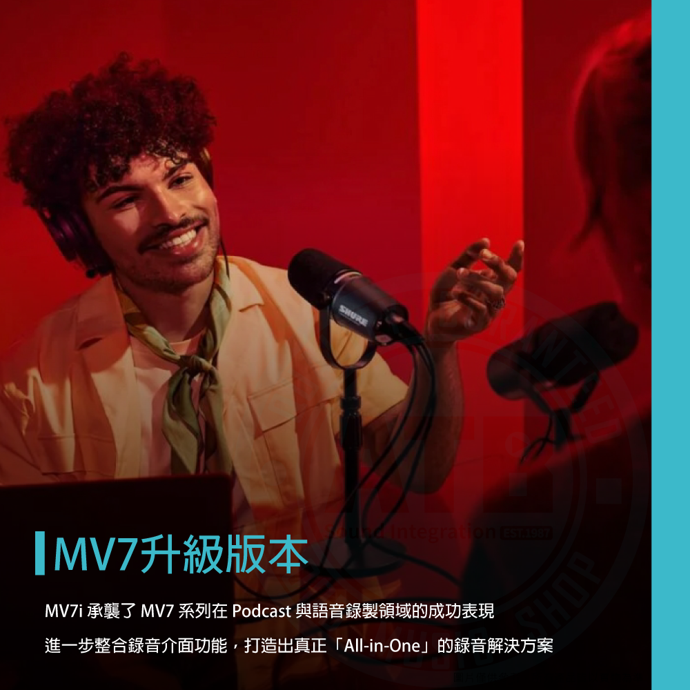◆ 主麥克風 Shure MV7i,動圈心形指向,適合語音與人聲錄製。