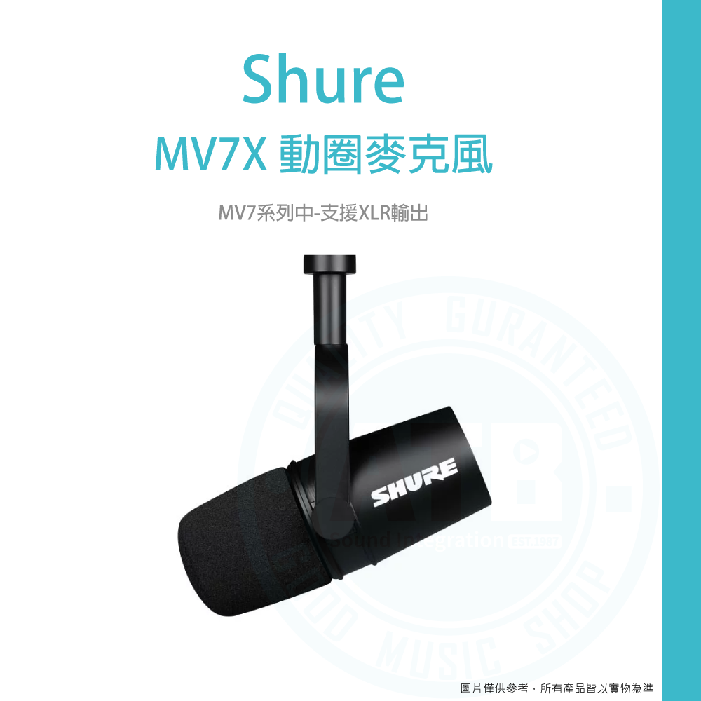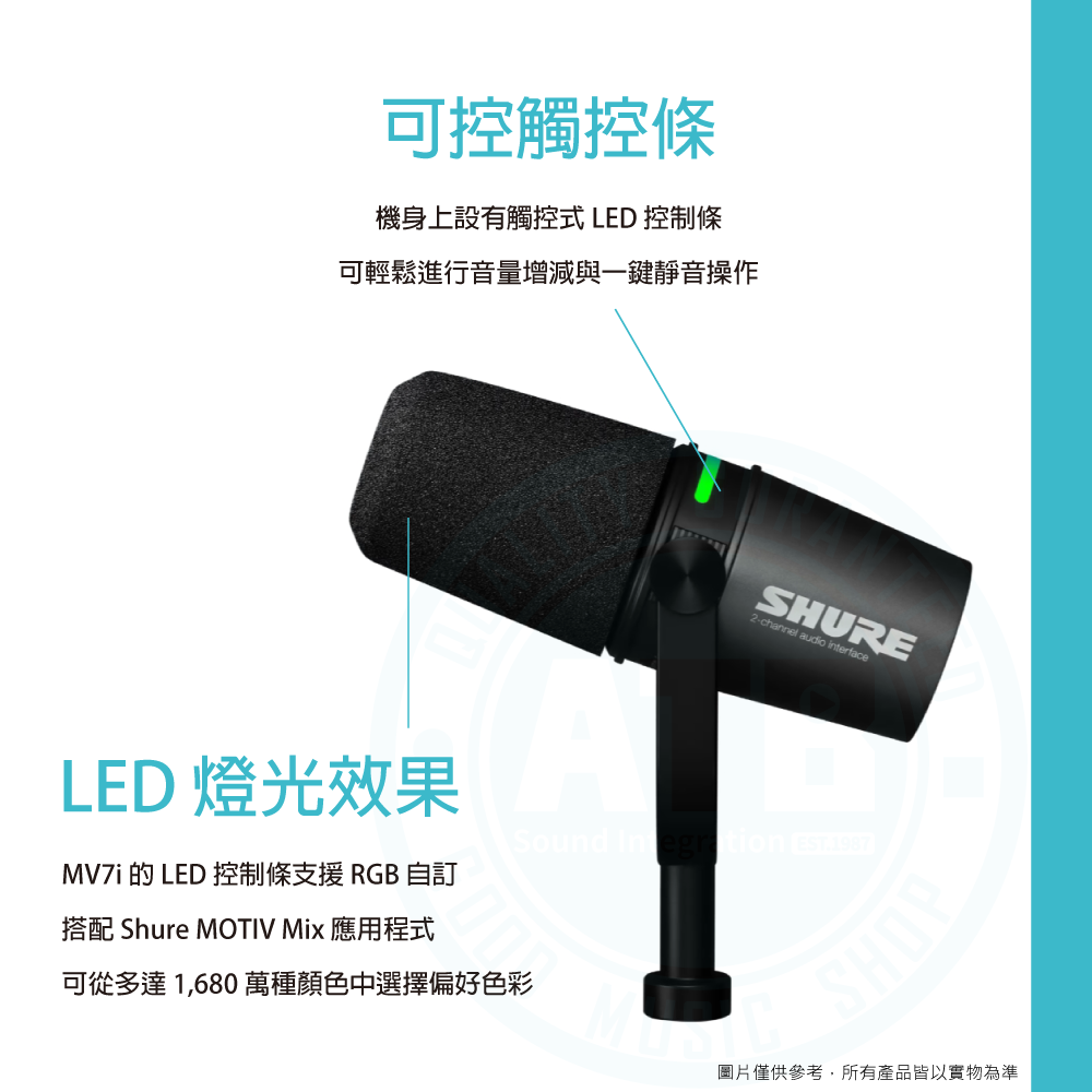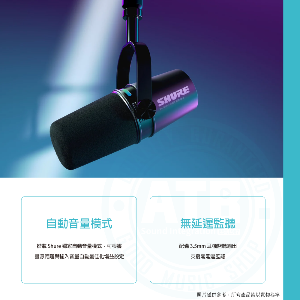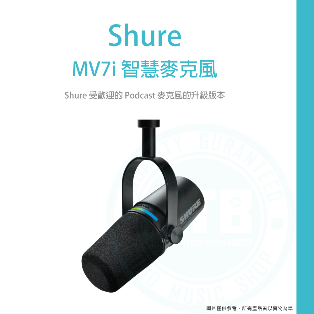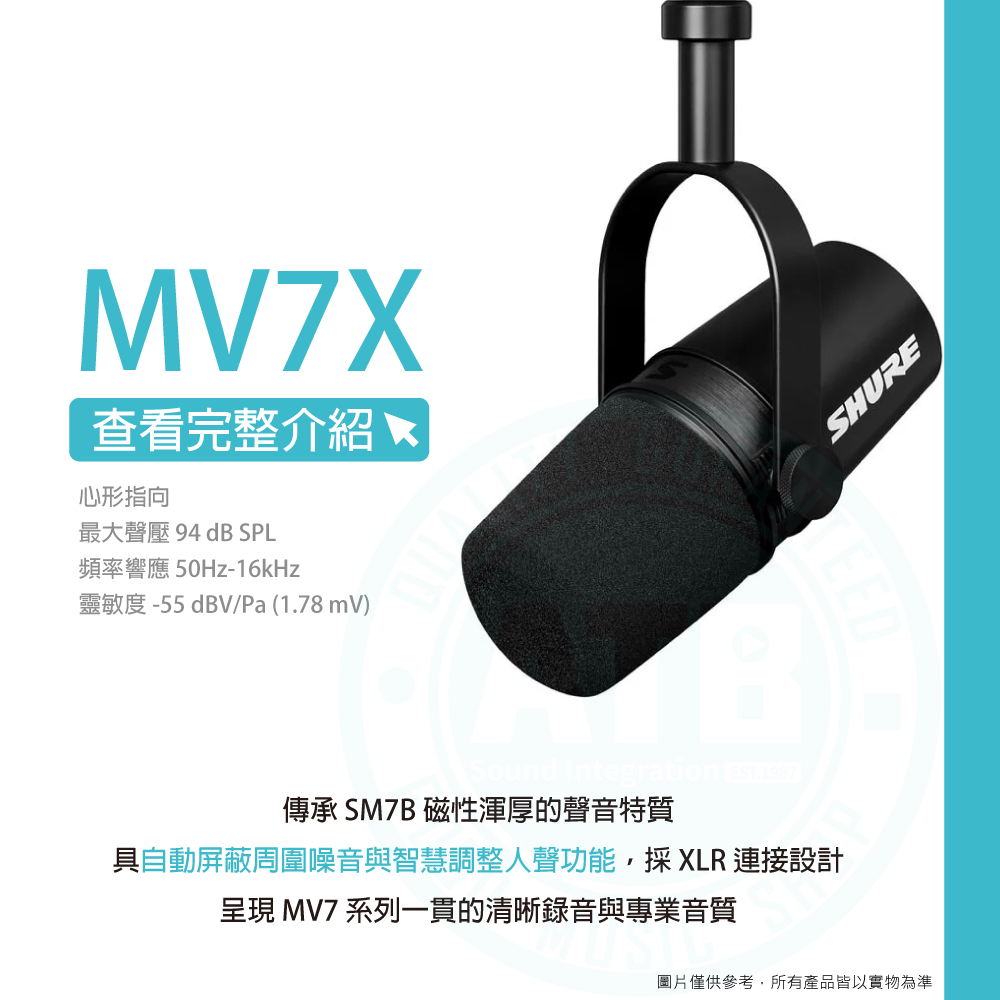 ◆ 主麥克風 Shure MV7i,動圈心形指向,適合語音與人聲錄製。