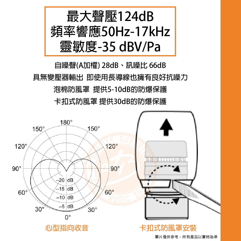◆ 最大聲壓124dB、頻率響應50Hz-17kHz、靈敏度-35 dBV/Pa