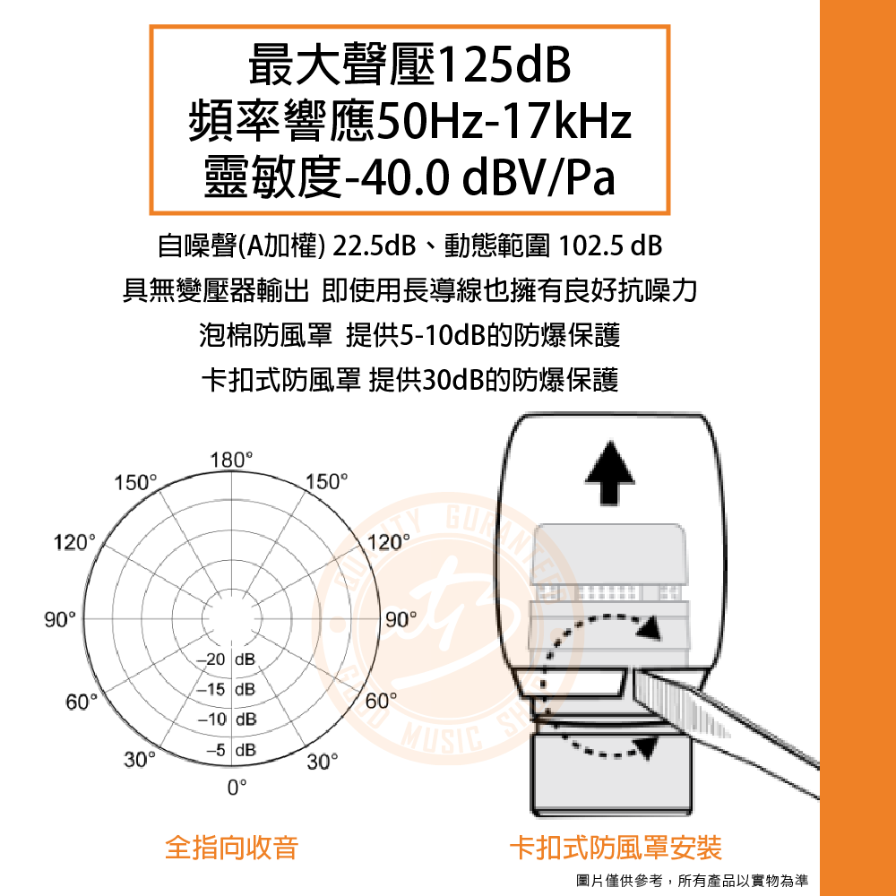 ◆ 最大聲壓125dB、頻率響應50Hz-17kHz、靈敏度-40.0 dBV/Pa